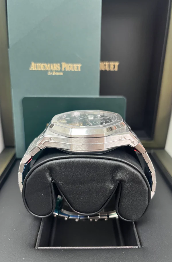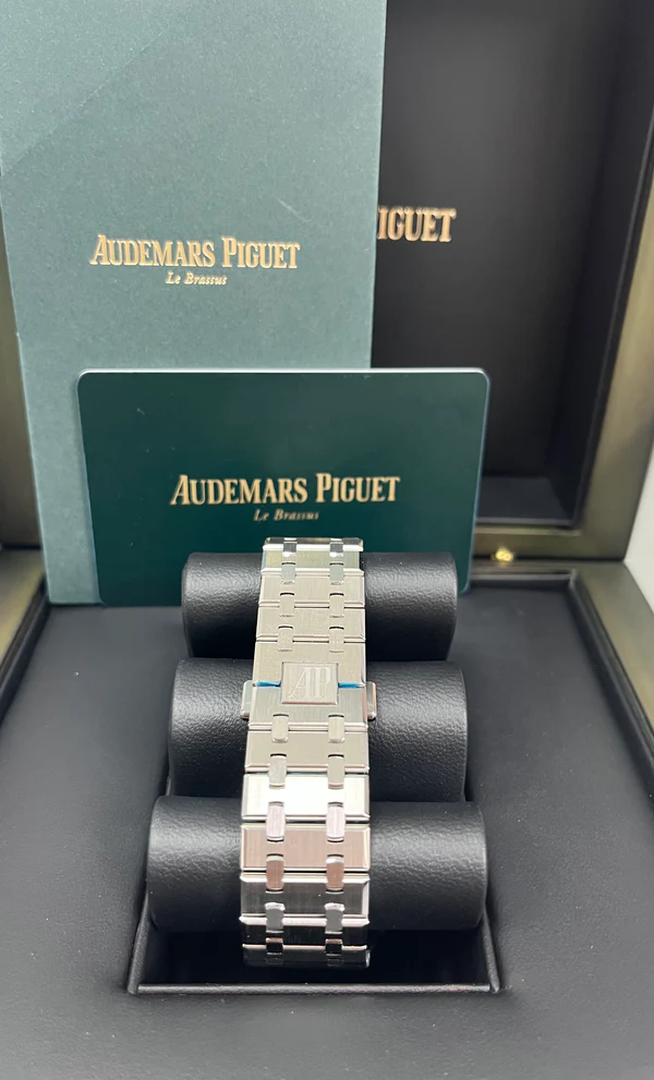 Black dial with “Grande Tapisserie” pattern, black counters, white gold applied hour-markers and Royal Oak hands with luminescent coating.