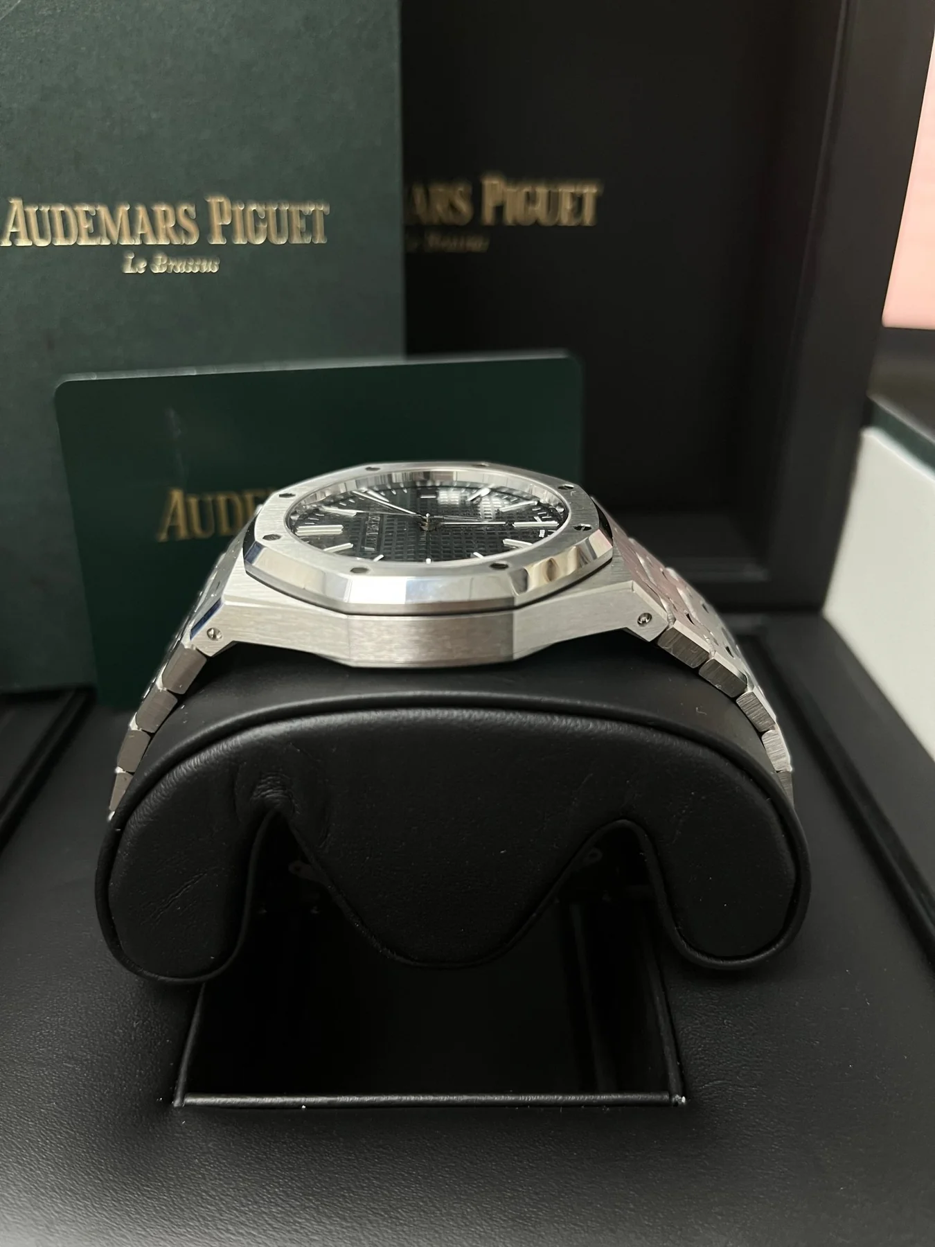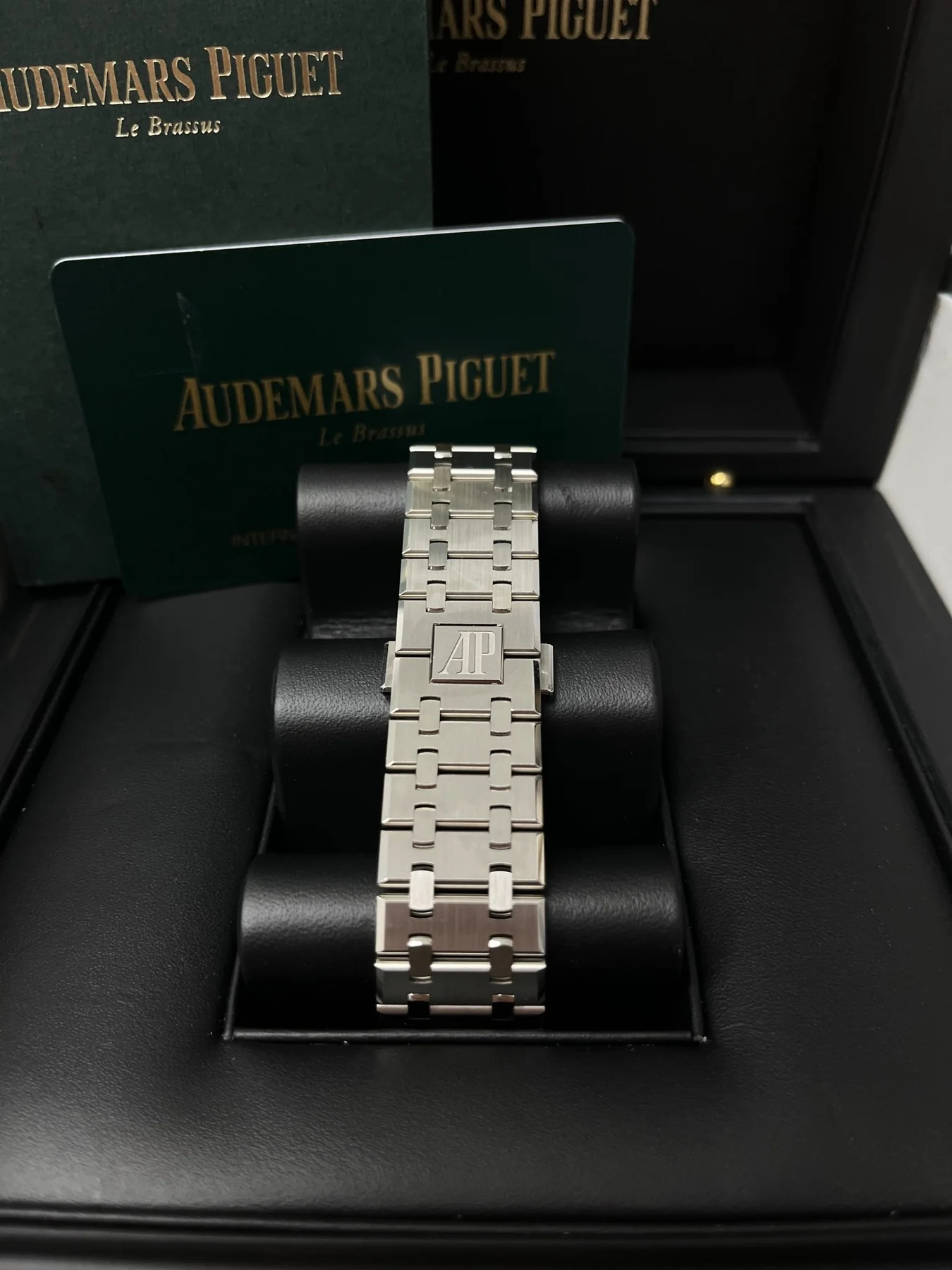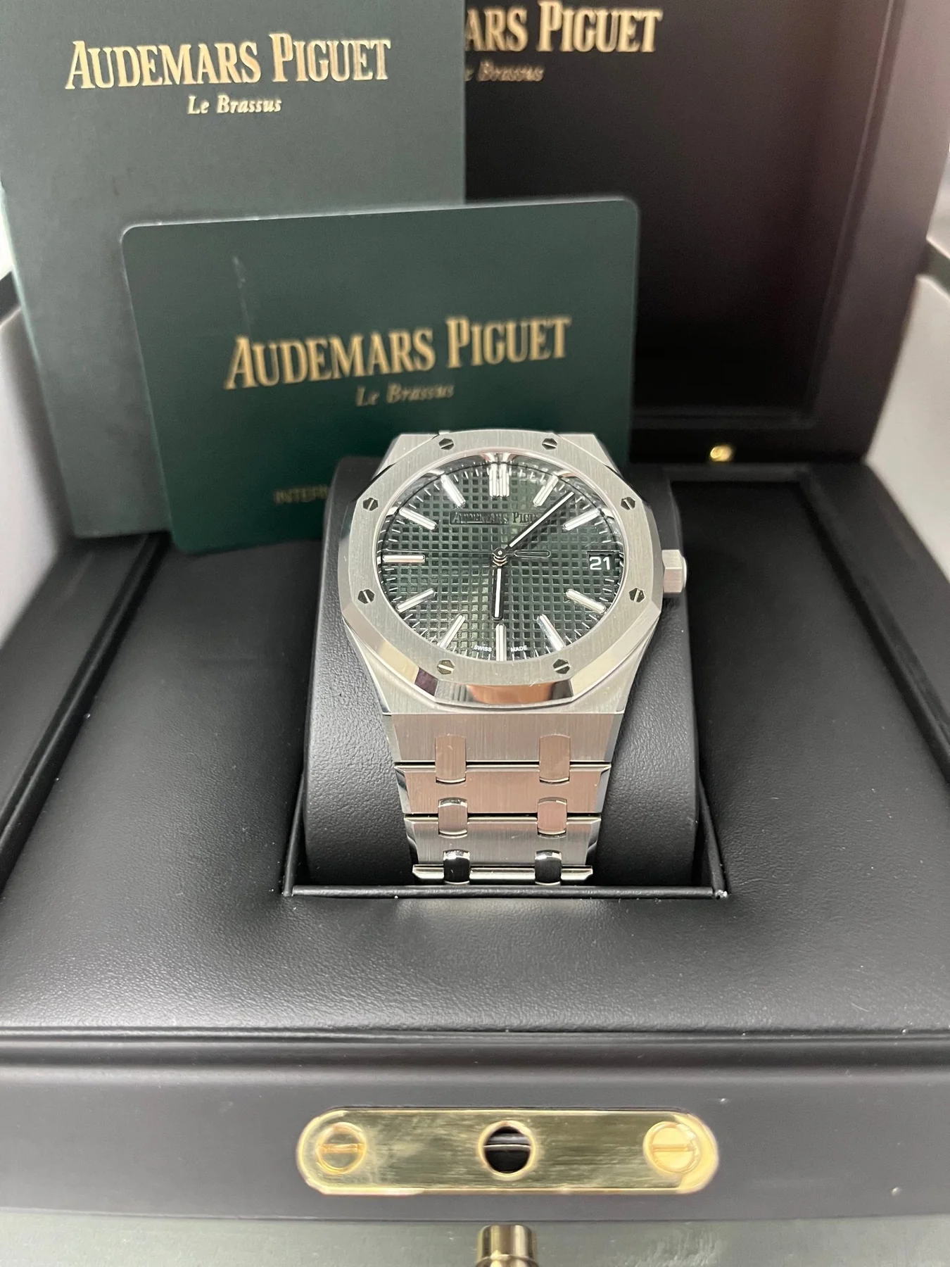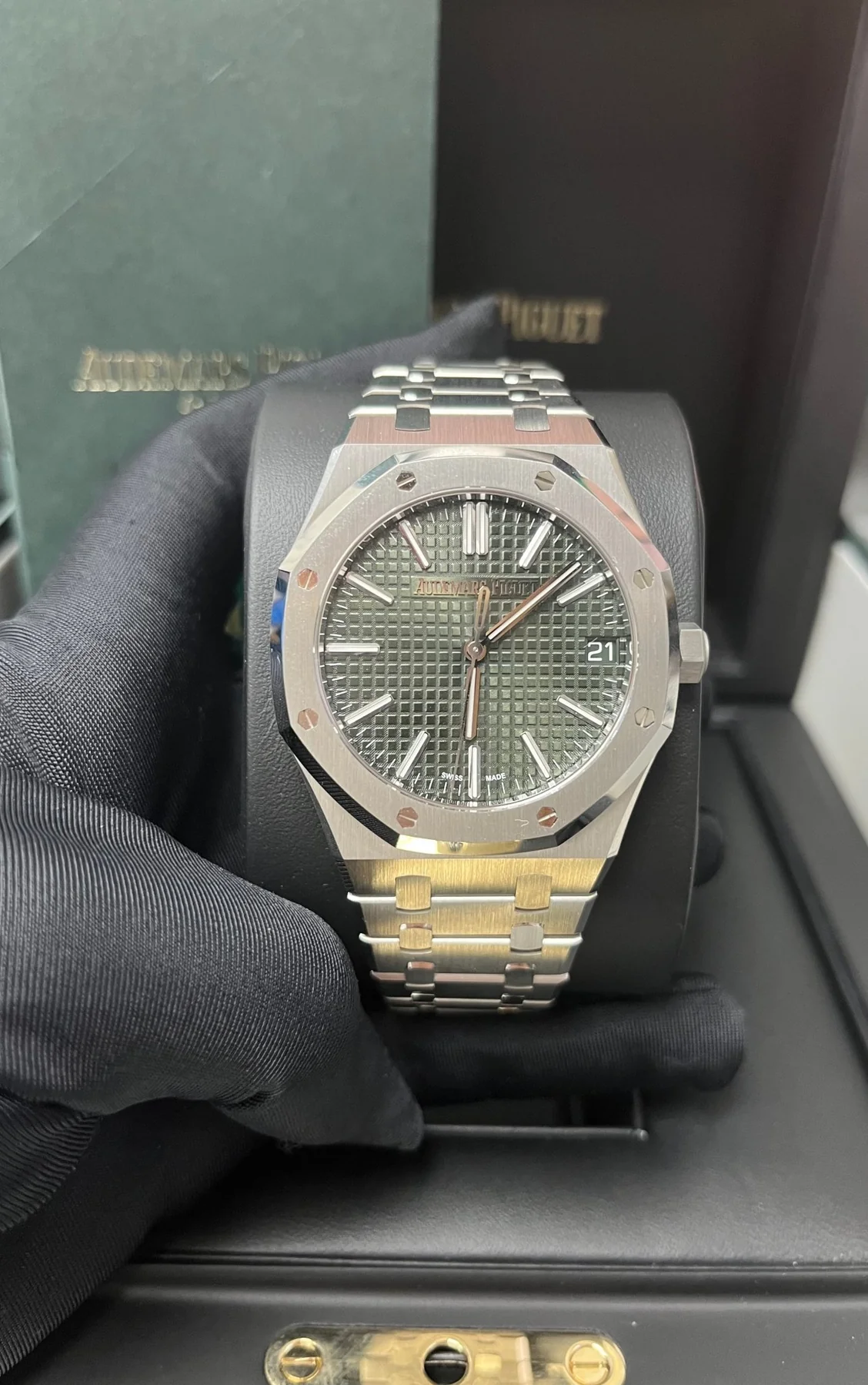 Khaki green dial with “Grande Tapisserie” pattern, white gold applied hour-markers and Royal Oak hands with luminescent coating.