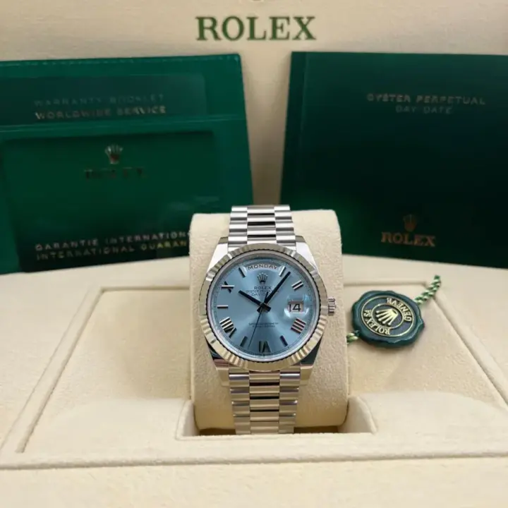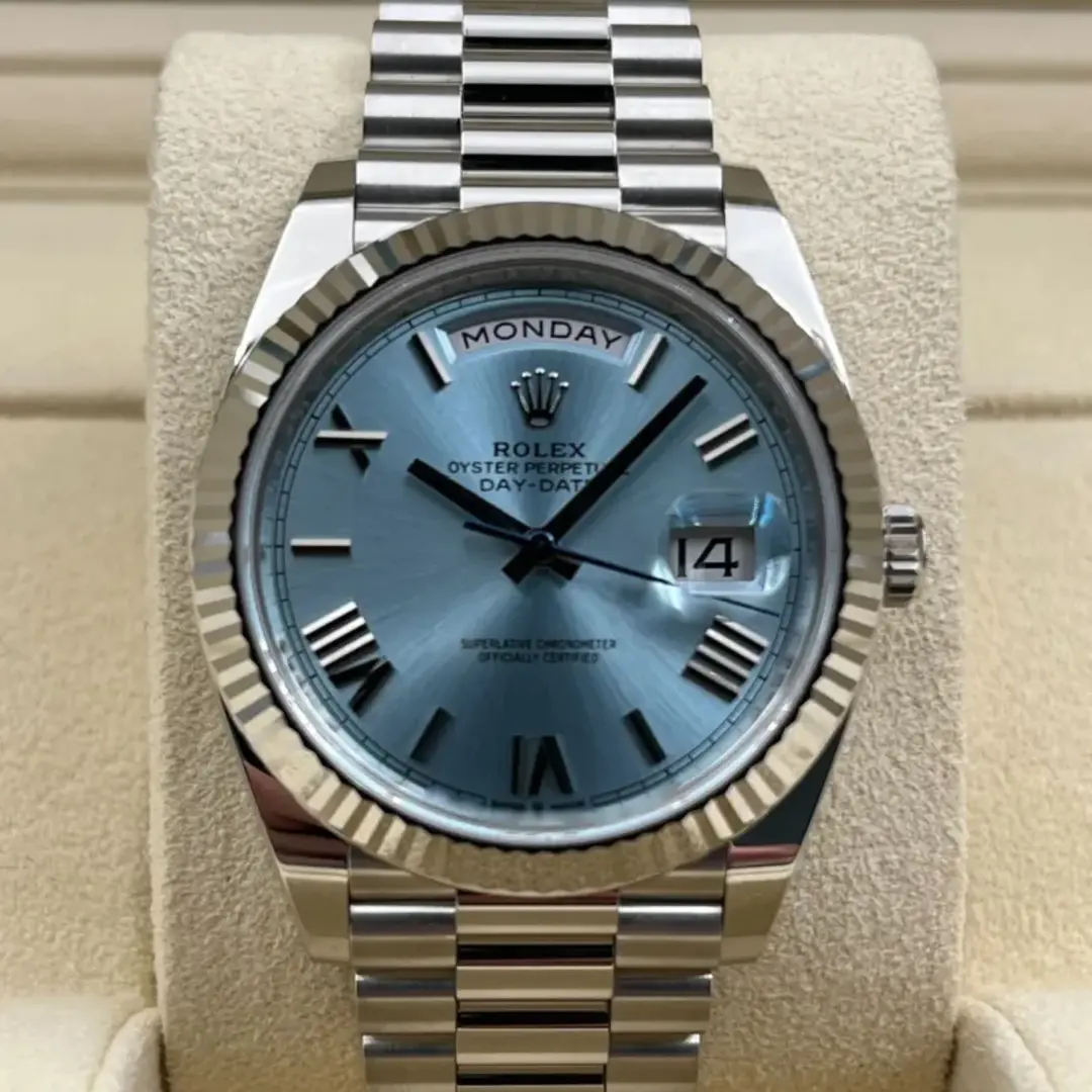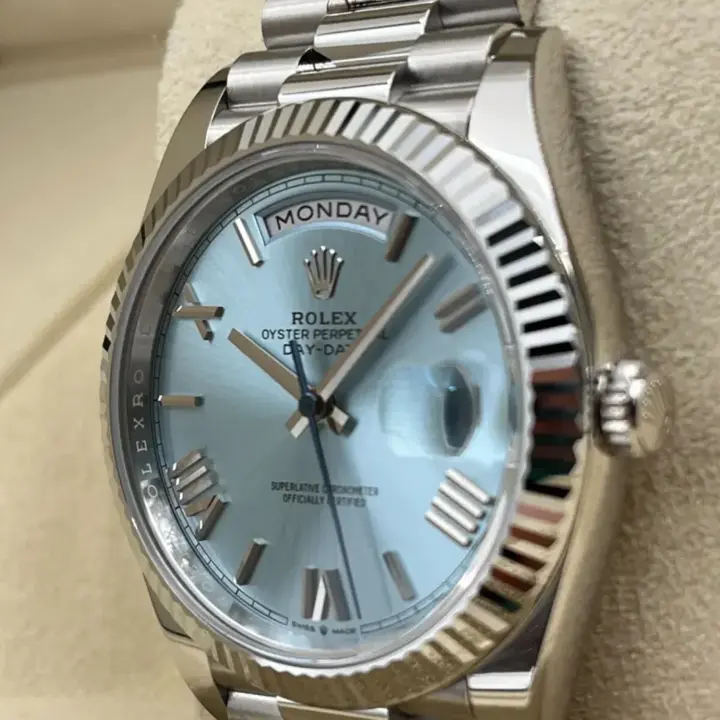 The ice-blue dial is the discreet and exclusive signature of a Rolex platinum watch. Rolex uses platinum, the noblest of metals, for the finest of watches. These exclusive dials can be found only on the Day-Date and the Cosmograph Daytona.