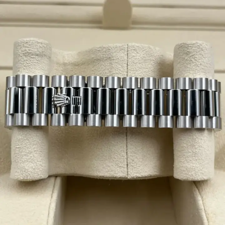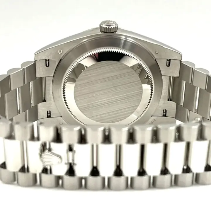 The Rolex fluted bezel is a mark of distinction. Originally, the fluting of the Oyster bezel had a functional purpose: it served to screw the bezel onto the case helping to ensure the waterproofness of the watch. It was therefore identical to the fluting on the case back, which was also screwed onto the case for waterproofness, using specific Rolex tools. Over time, the fluting became an aesthetic element, a genuine Rolex signature feature. Today the fluted bezel is a mark of distinction, in platinum on this Day-Date 40.