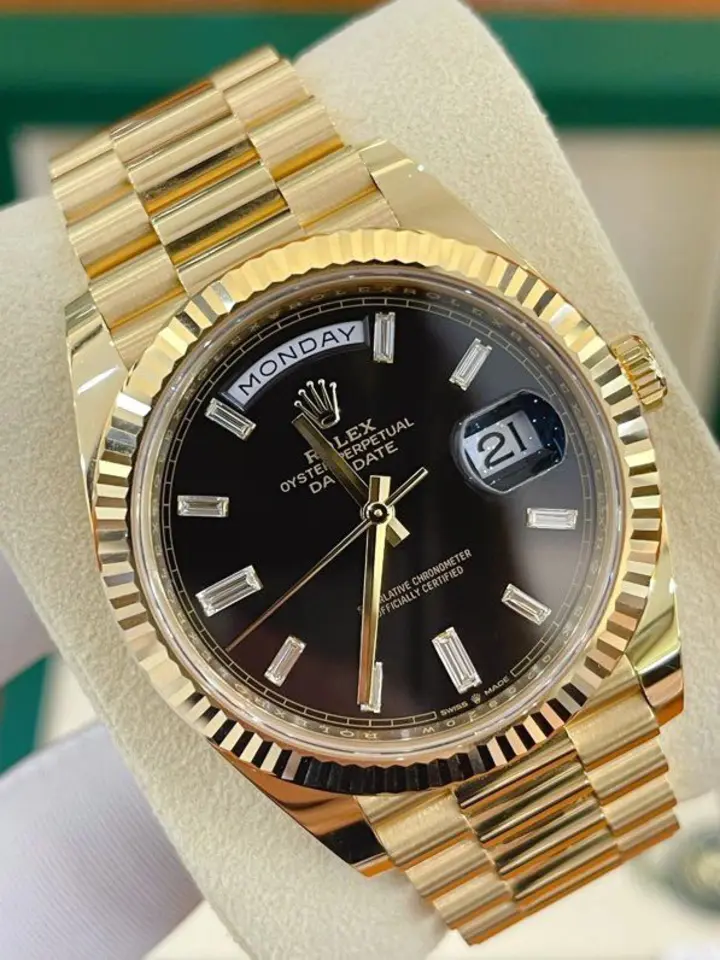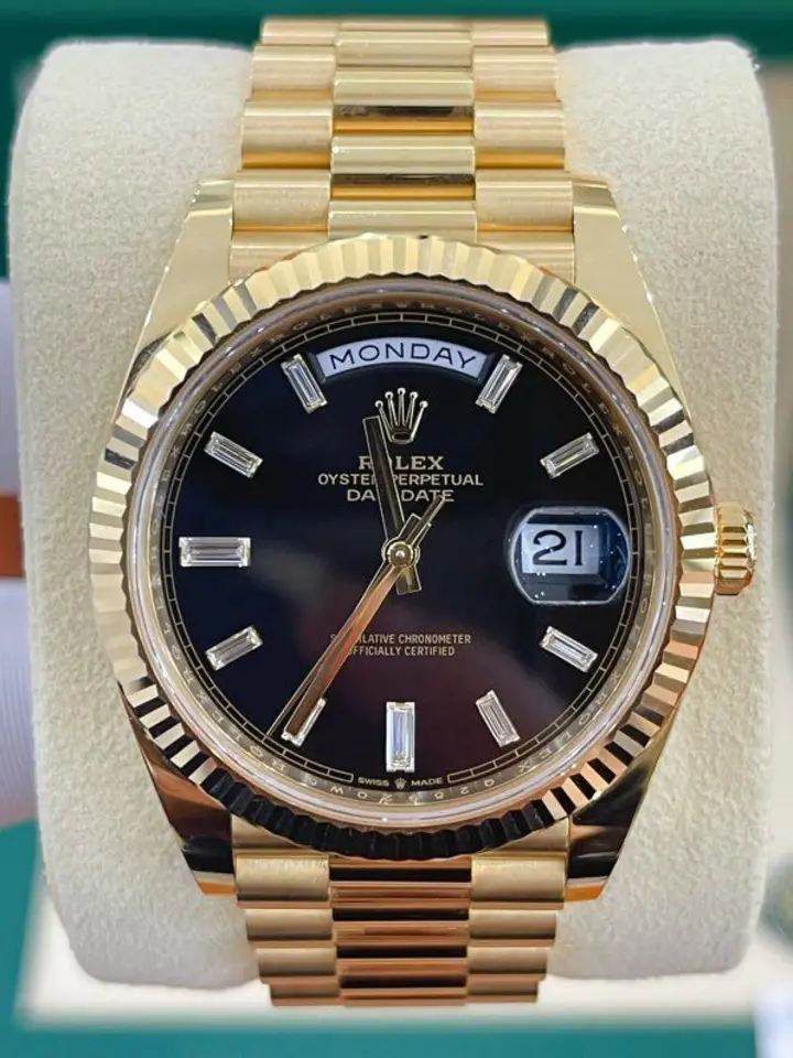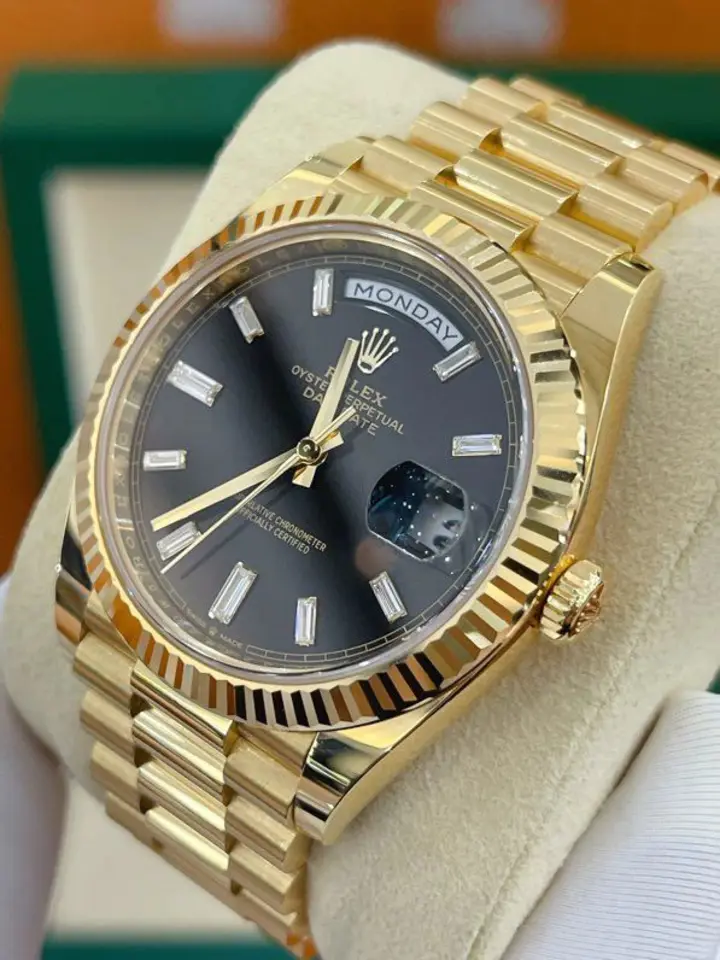 Dial: bright black, diamond-set dial, and day and date window.