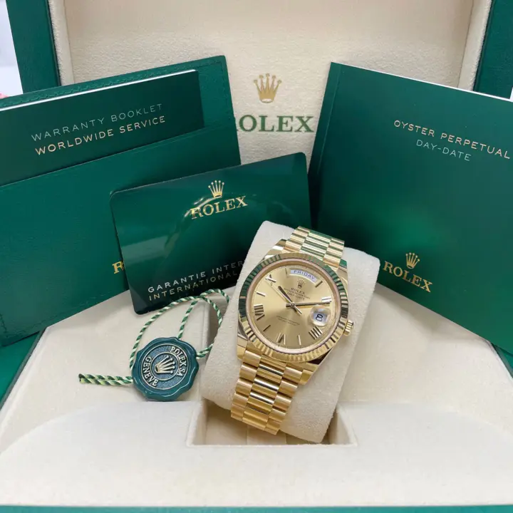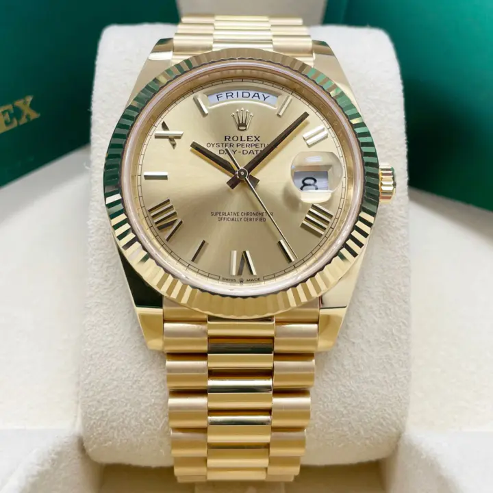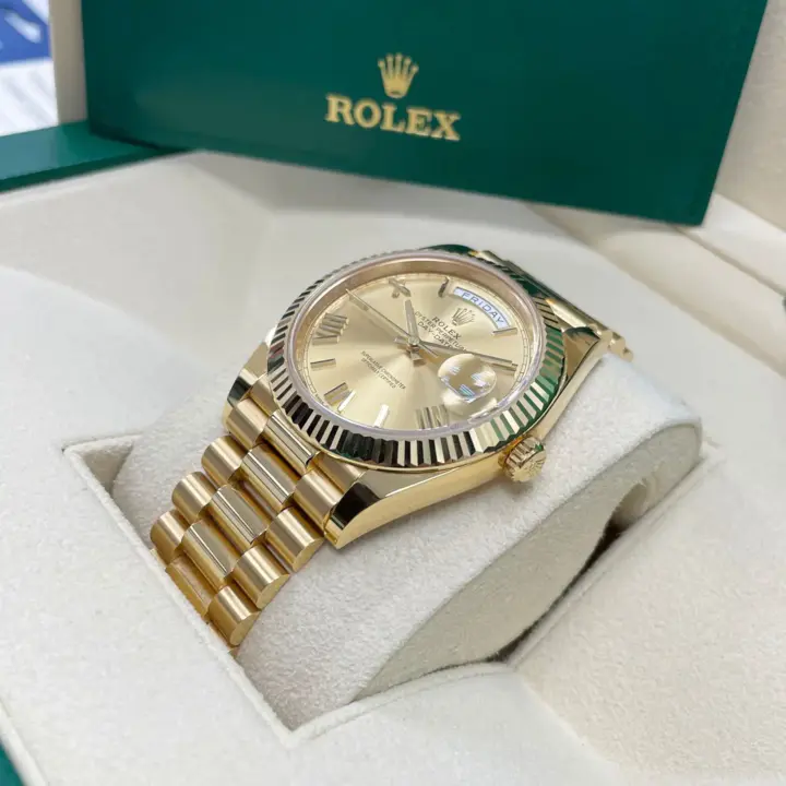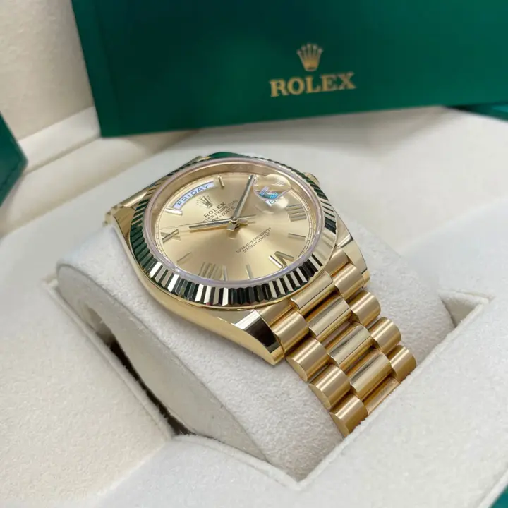 The Rolex fluted bezel is a mark of distinction. Originally, the fluting of the Oyster bezel had a functional purpose: it served to screw the bezel onto the case helping to ensure the waterproofness of the watch. It was therefore identical to the fluting on the case back, which was also screwed onto the case for waterproofness, using specific Rolex tools. Over time, the fluting became an aesthetic element, a genuine Rolex signature feature. Today the fluted bezel is a mark of distinction, in gold on this Day-Date 40.
