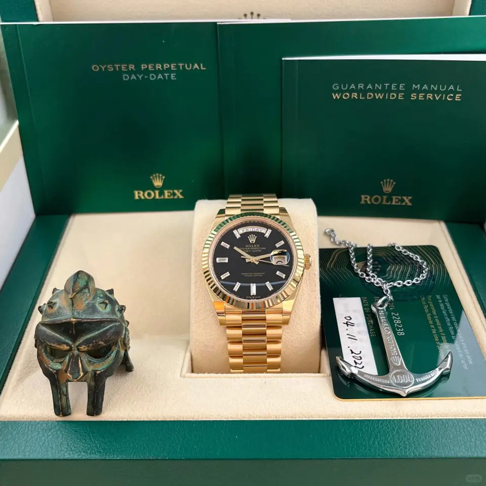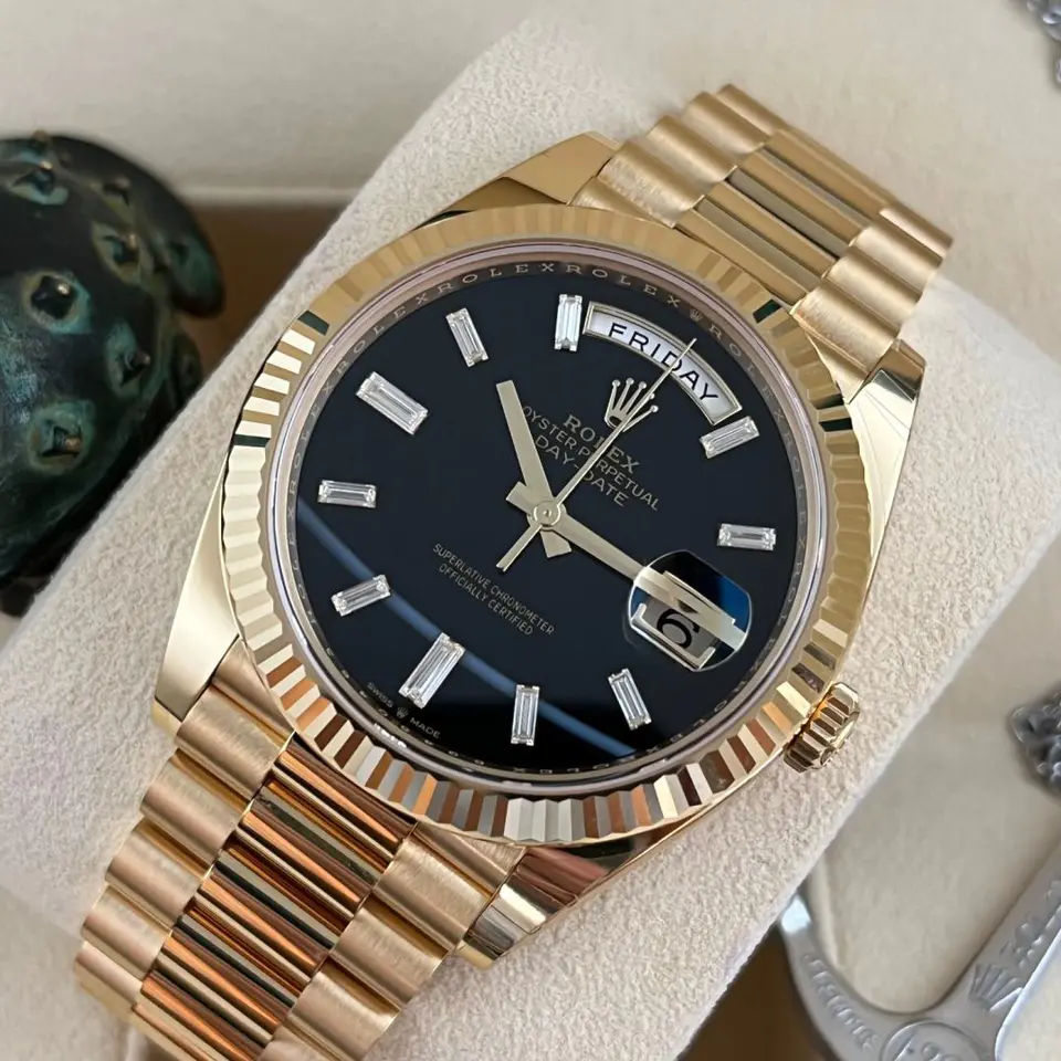 The Rolex fluted bezel is a mark of distinction. Originally, the fluting of the Oyster bezel had a functional purpose: it served to screw the bezel onto the case helping to ensure the waterproofness of the watch. It was therefore identical to the fluting on the case back, which was also screwed onto the case for waterproofness, using specific Rolex tools. Over time, the fluting became an aesthetic element, a genuine Rolex signature feature. Today the fluted bezel is a mark of distinction, in gold on this Day-Date 40.