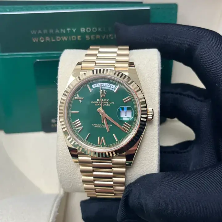 The Rolex fluted bezel is a mark of distinction. Originally, the fluting of the Oyster bezel had a functional purpose: it served to screw the bezel onto the case helping to ensure the waterproofness of the watch. It was therefore identical to the fluting on the case back, which was also screwed onto the case for waterproofness, using specific Rolex tools. Over time, the fluting became an aesthetic element, a genuine Rolex signature feature. Today the fluted bezel is a mark of distinction, in gold on this Day-Date 40.