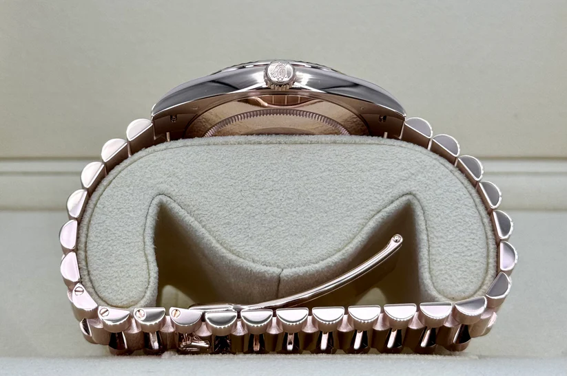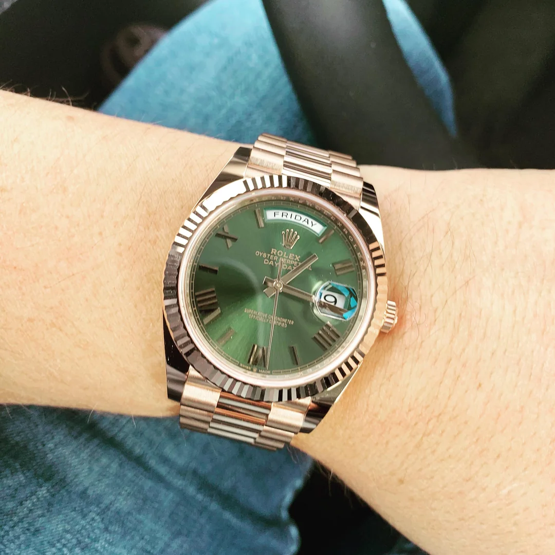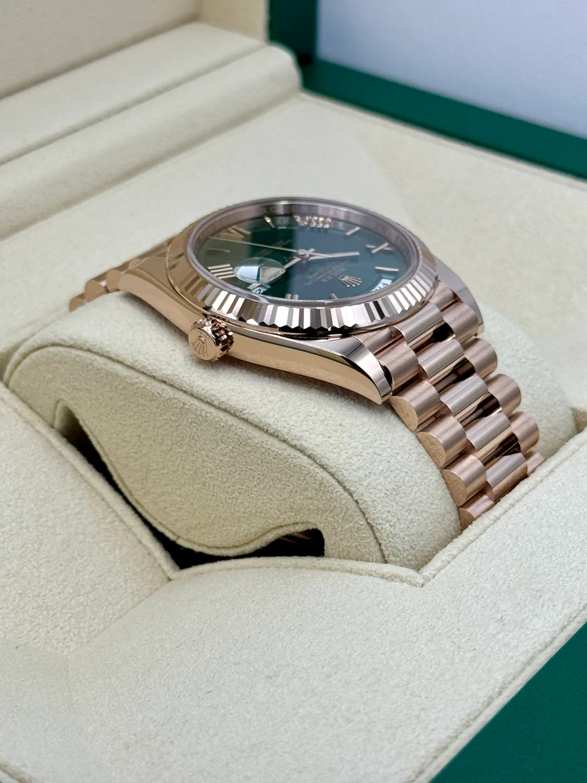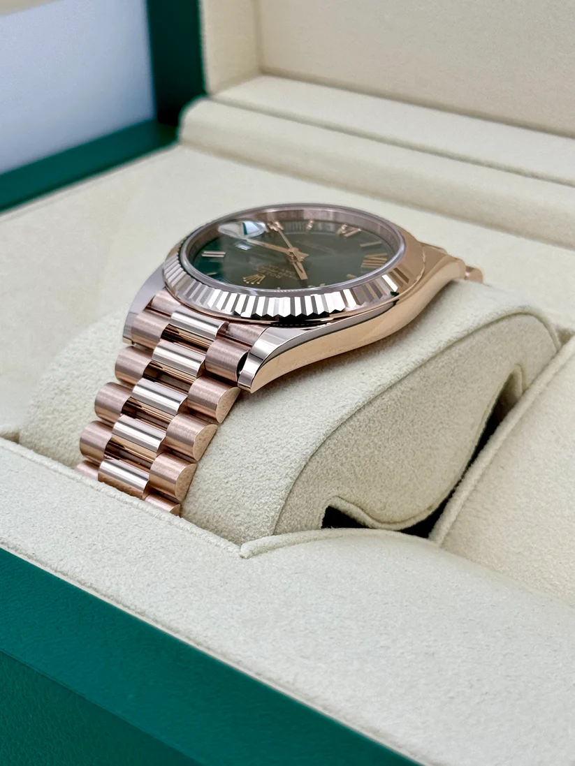 18kt Rose gold case with an 18kt rose gold president bracelet. Fixed fluted 18kt yellow gold bezel. Olive green dial with yellow gold hands and Roman numeral and index hour markers. Minute markers around the outer rim. Dial Type: Analog. Date display at the 3 o'clock position. Day of the week display centered on the 12 o'clock position. Automatic movement. Scratch-resistant sapphire crystal. Screw down crown. Solid case back. Case diameter: 40 mm. Round case shape. Fold-over clasp. Water-resistant at 100 meters / 330 feet. Functions: date, day, hour, minute, second. Luxury watch style. Watch label: Swiss Made.