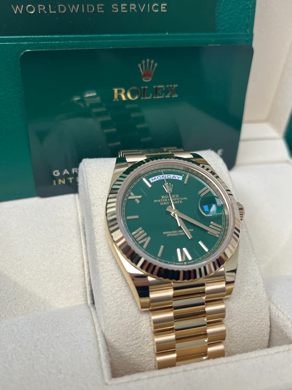 The Rolex fluted bezel is a mark of distinction. Originally, the fluting of the Oyster bezel had a functional purpose: it served to screw the bezel onto the case helping to ensure the waterproofness of the watch. It was therefore identical to the fluting on the case back, which was also screwed onto the case for waterproofness, using specific Rolex tools. Over time, the fluting became an aesthetic element, a genuine Rolex signature feature. Today the fluted bezel is a mark of distinction, in gold on this Day-Date 40.