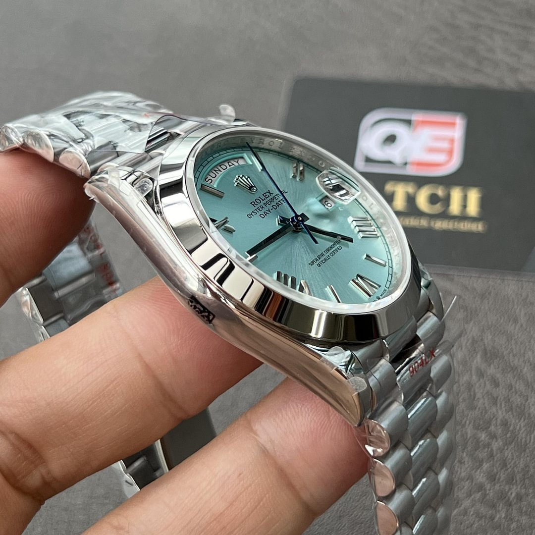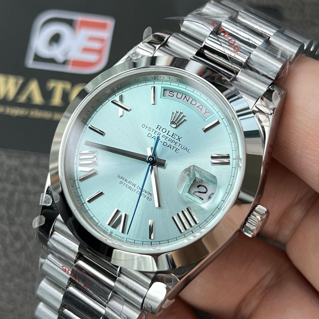 Dial: Ice Blue Dial  (Roman Numerals) and day and date window.