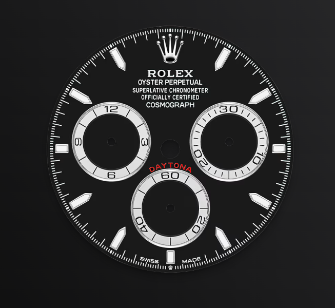 This is a visual representation of the Rolex Cosmograph Daytona 126500LN watch and its features: