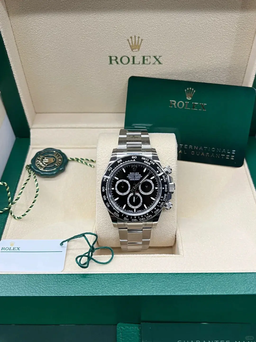 | Bezel | Fixed black Cerachrom with engraved platinum tachymeter scale |