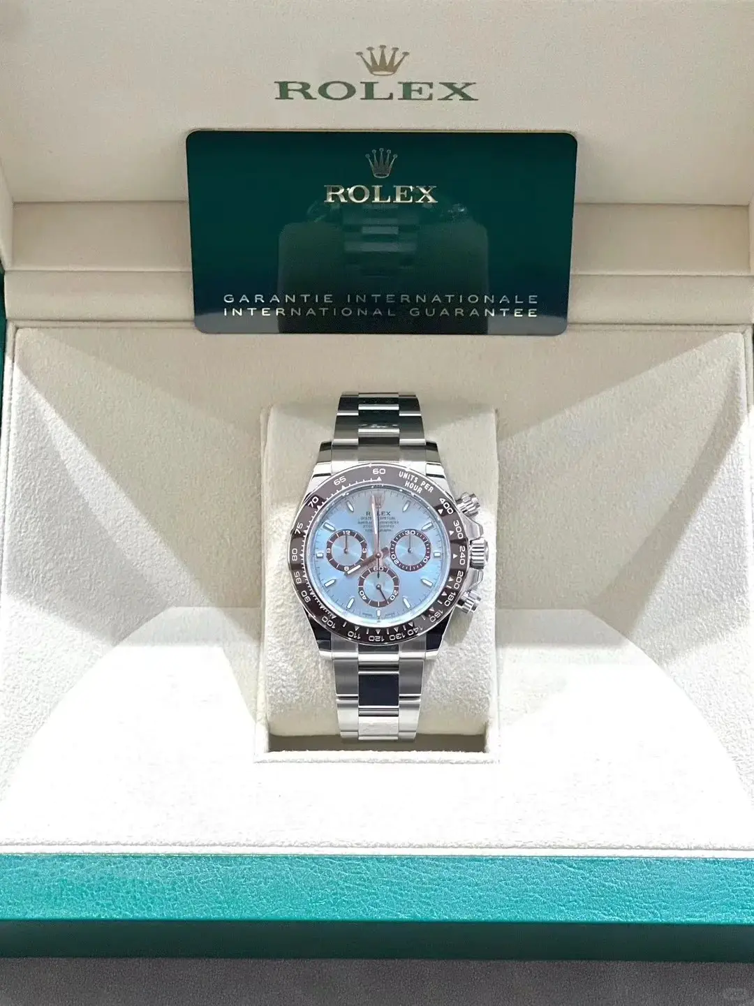 The watch is unworn and comes complete with full set of original accessories, such as watch box, warranty card dated recently, booklets and manuals.