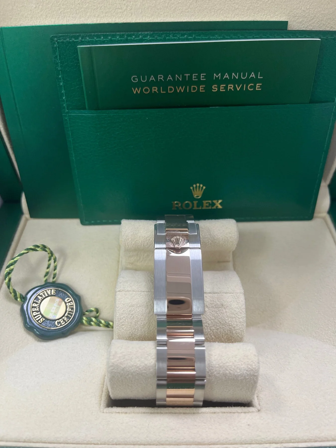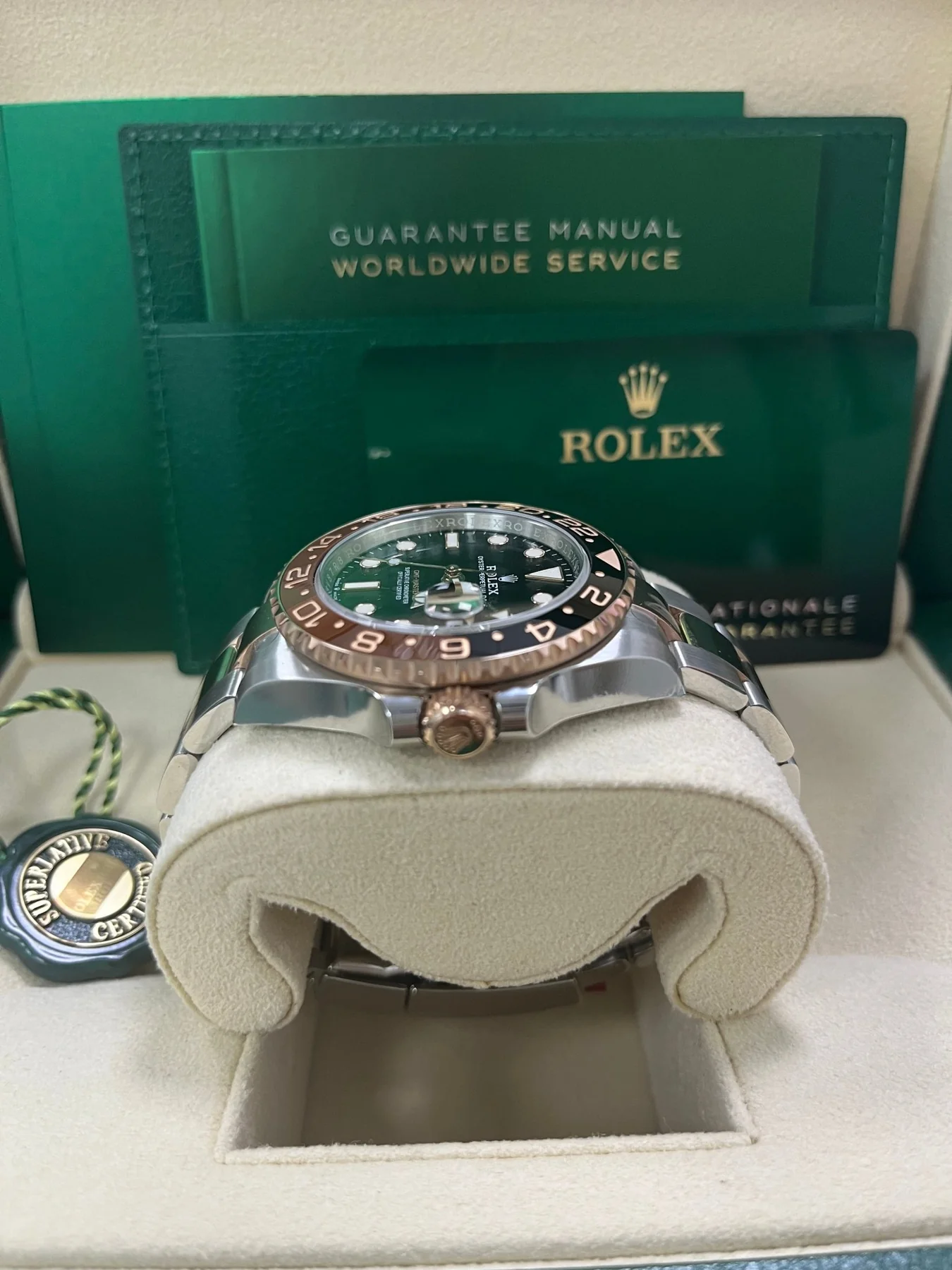 Movement: Self-winding calibre 3285 automatic movement with sweeping seconds and date function. Independant GMT hour hand, allowing the tracking of a second time zone. (70 hour power reserve).