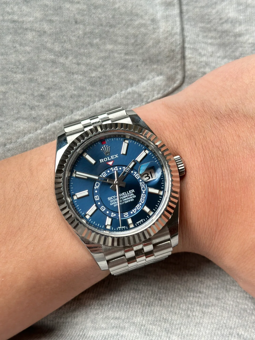 The Oyster Perpetual Sky-Dweller is available in white gold and Oystersteel with a bright blue dial and a Jubilee bracelet. -m336934-0006 42mm