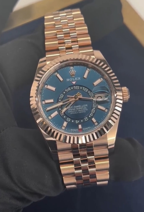 The Oyster Perpetual Sky-Dweller in 18 ct Everose gold with a turquoise dial and a Jubilee bracelet. -m336935-0005 42mm