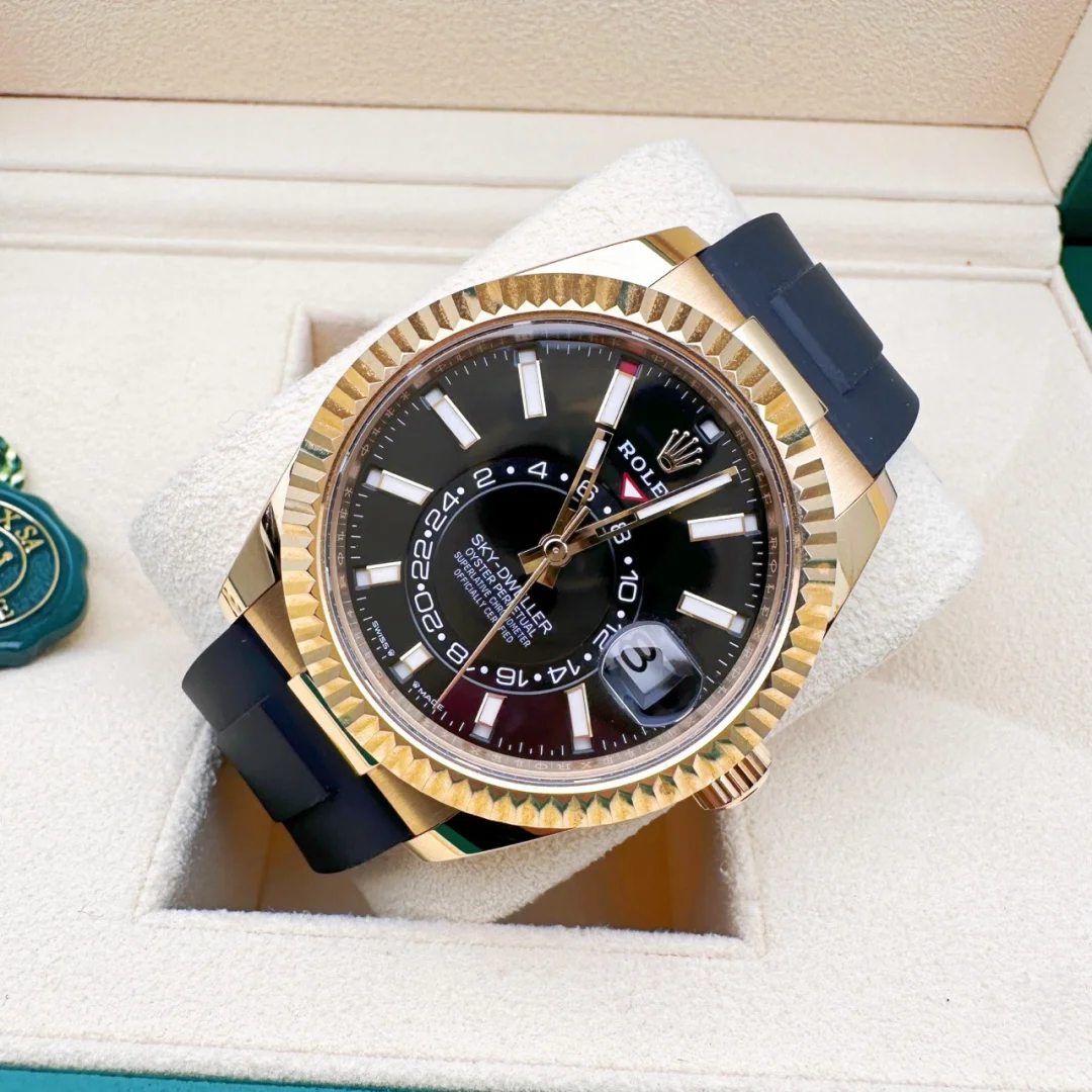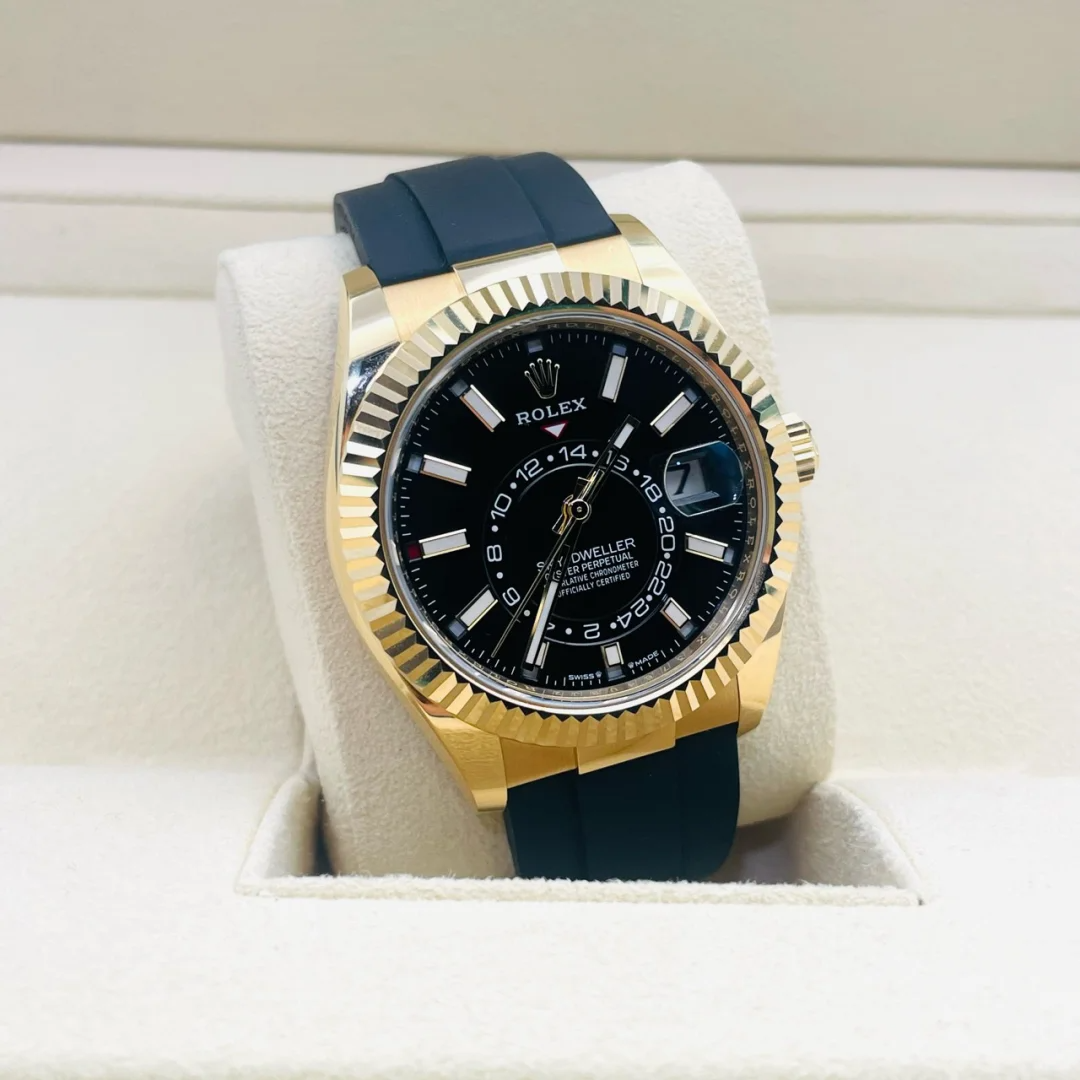 The Oyster Perpetual Sky-Dweller is available in 18 ct yellow gold with a glossy black dial and an Oysterflex bracelet. -m336238-0002 42mm