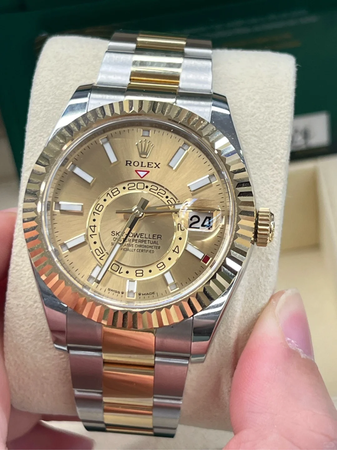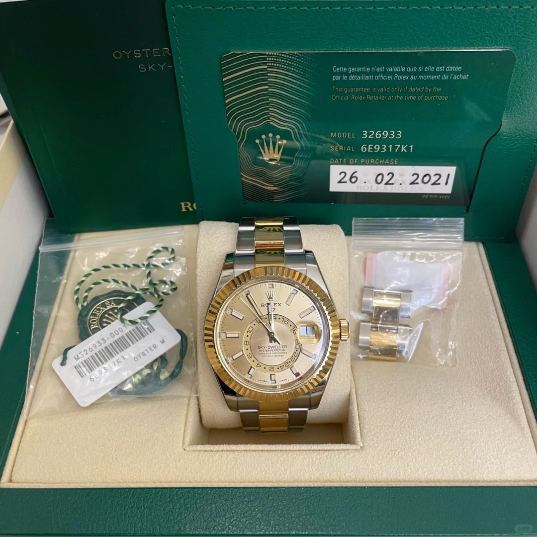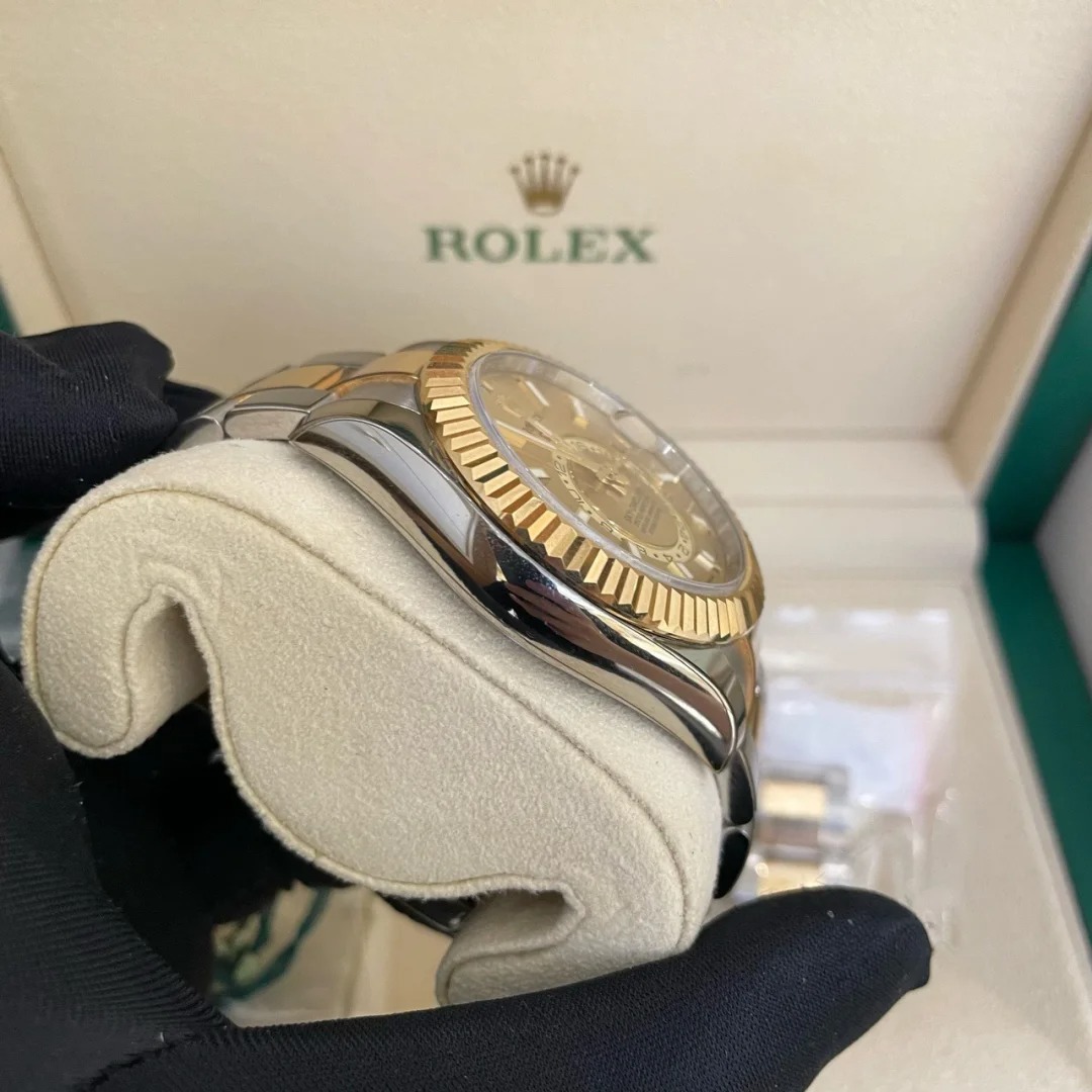 The Oyster Perpetual Sky-Dweller is available in yellow gold and Oystersteel with a champagne-coloured dial and an Oyster bracelet. -m336933-0001 42mm