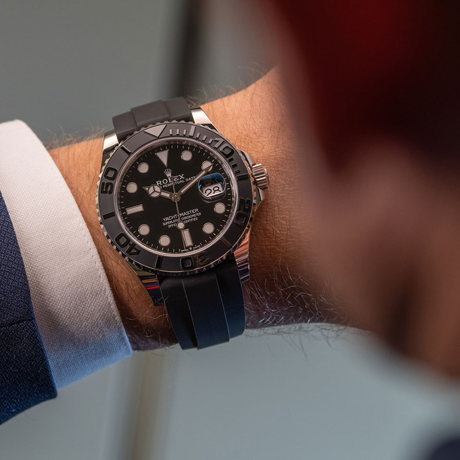 The most desirable Yacht-Master Rolex ever made. A fully fledged sports watch (waterproof to 100m), yet elegant and discreet enough for the boardroom, this precious metal Yacht-Master ref. 226659 is fitted to the super comfy black Oysterflex strap. Sporting a matt finished bi-directional Cerachrom bezel (developed by Rolex to be scratch & fade resistant ) and a highly legible black dial with Chromalight hands & markers. Powered by Rolex's updated self-winding calibre 3235, now with a generous 70-hour power–reserve. Waterproof to 100m.