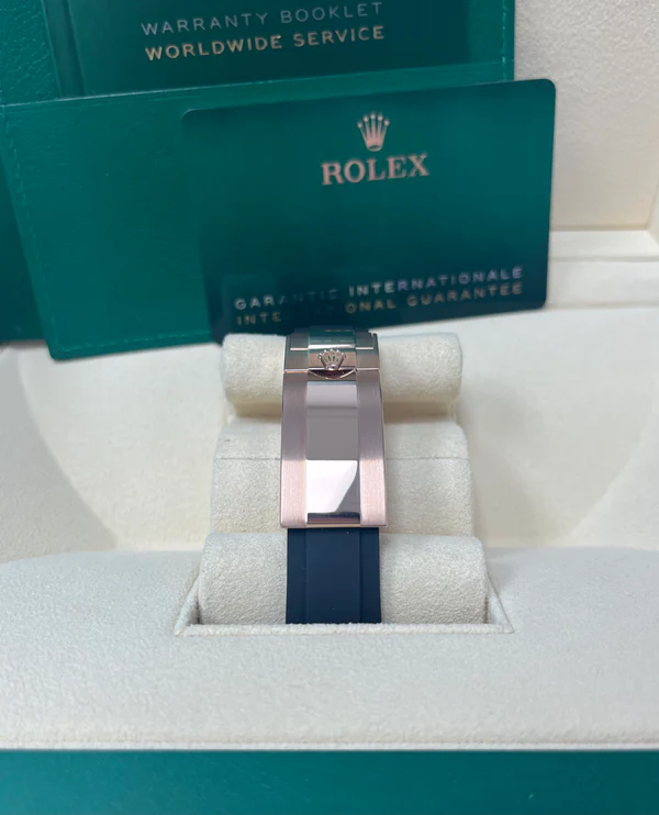 The Yacht-Master's new Oysterflex bracelet, developed by Rolex and patented, offers a sporty alternative to metal bracelets. The bracelet attaches to the watch case and the Oysterlock safety clasp by a flexible titanium and nickel alloy metal blade. The blade is overmoulded with high-performance black elastomer which is particularly resistant to environmental effects, very durable and perfectly inert for the wearer of the watch. For enhanced comfort, the inside of the Oysterflex bracelet is equipped with a patented longitudinal cushion system that stabilizes the watch on the wrist and fitted with an 18 ct Everose gold Oysterlock safety clasp. It also features the Rolex Glidelock extension system, designed by the brand and patented. This inventive toothed mechanism, integrated beneath the clasp, allows fine adjustment of the bracelet length by some 15 mm in increments of approximately 2.5 mm, without the use of tools.