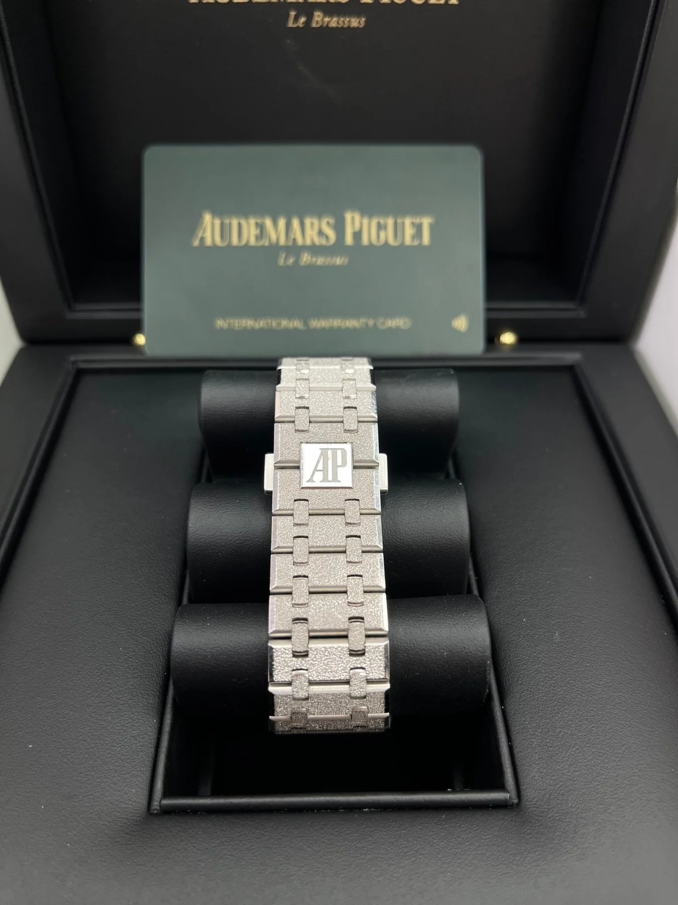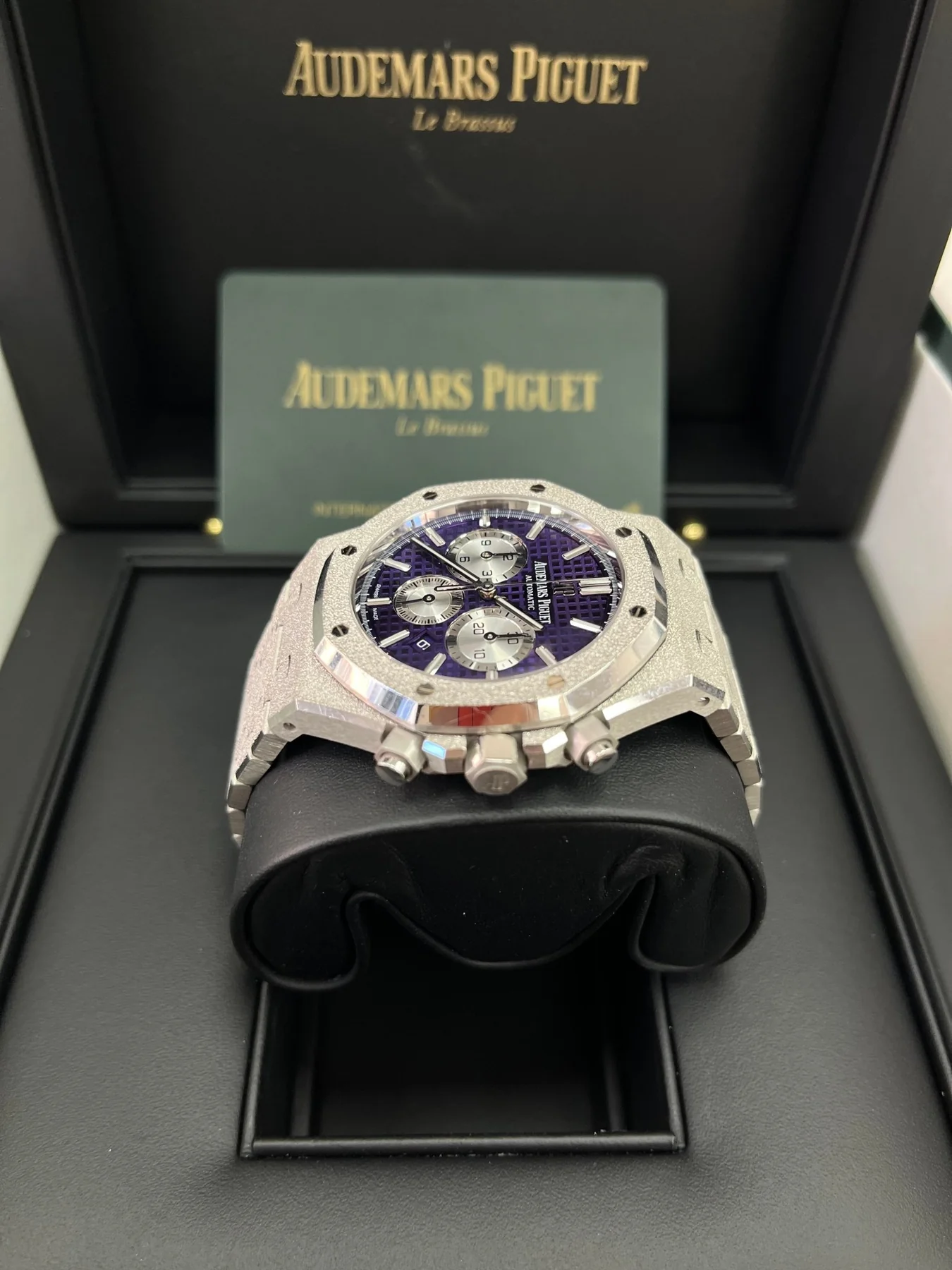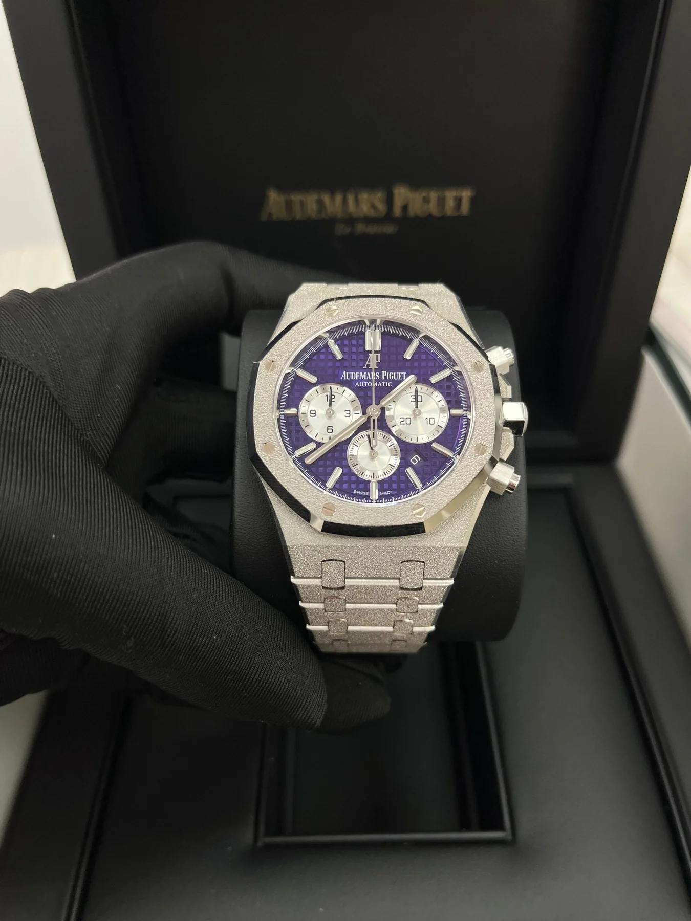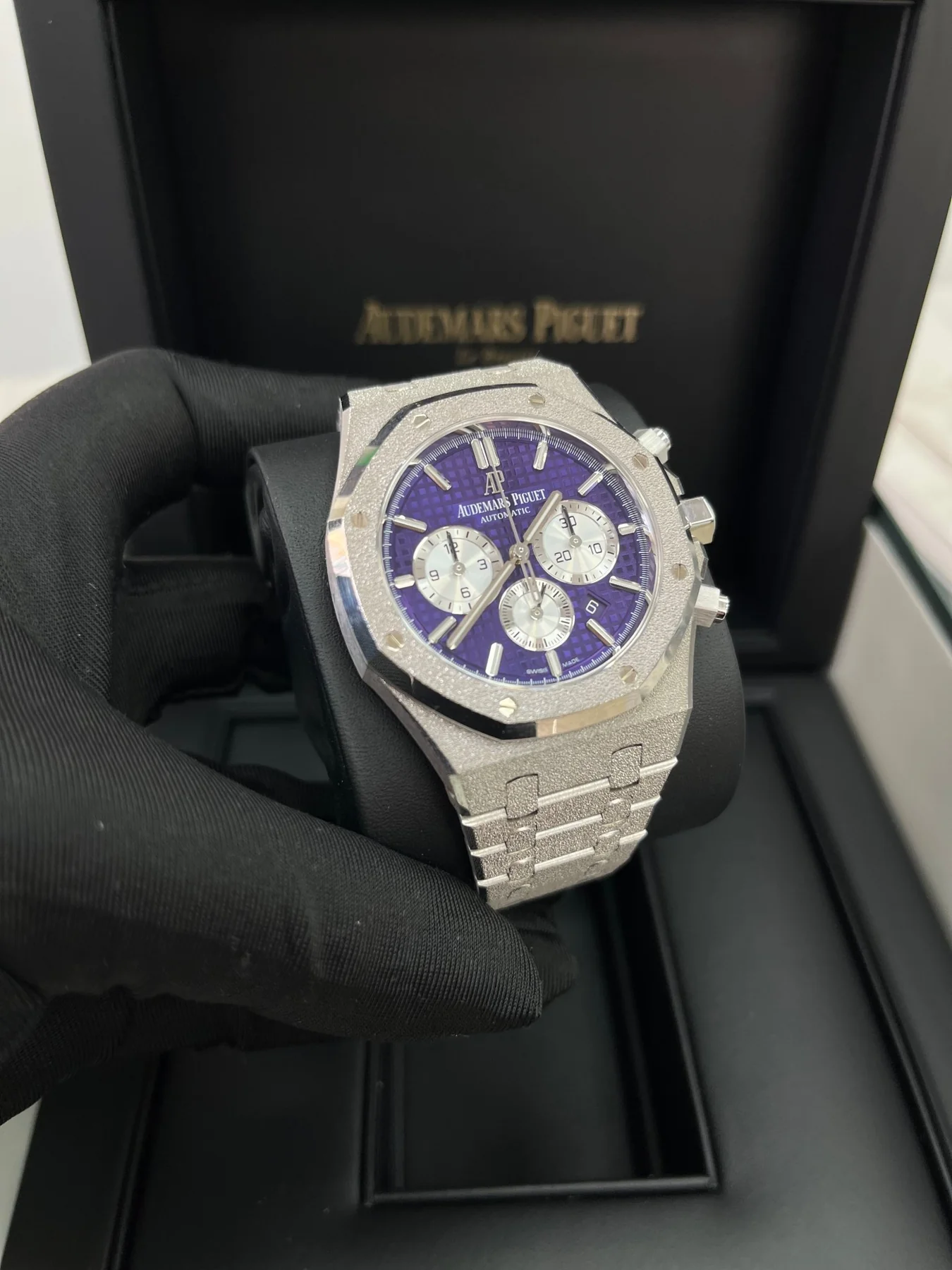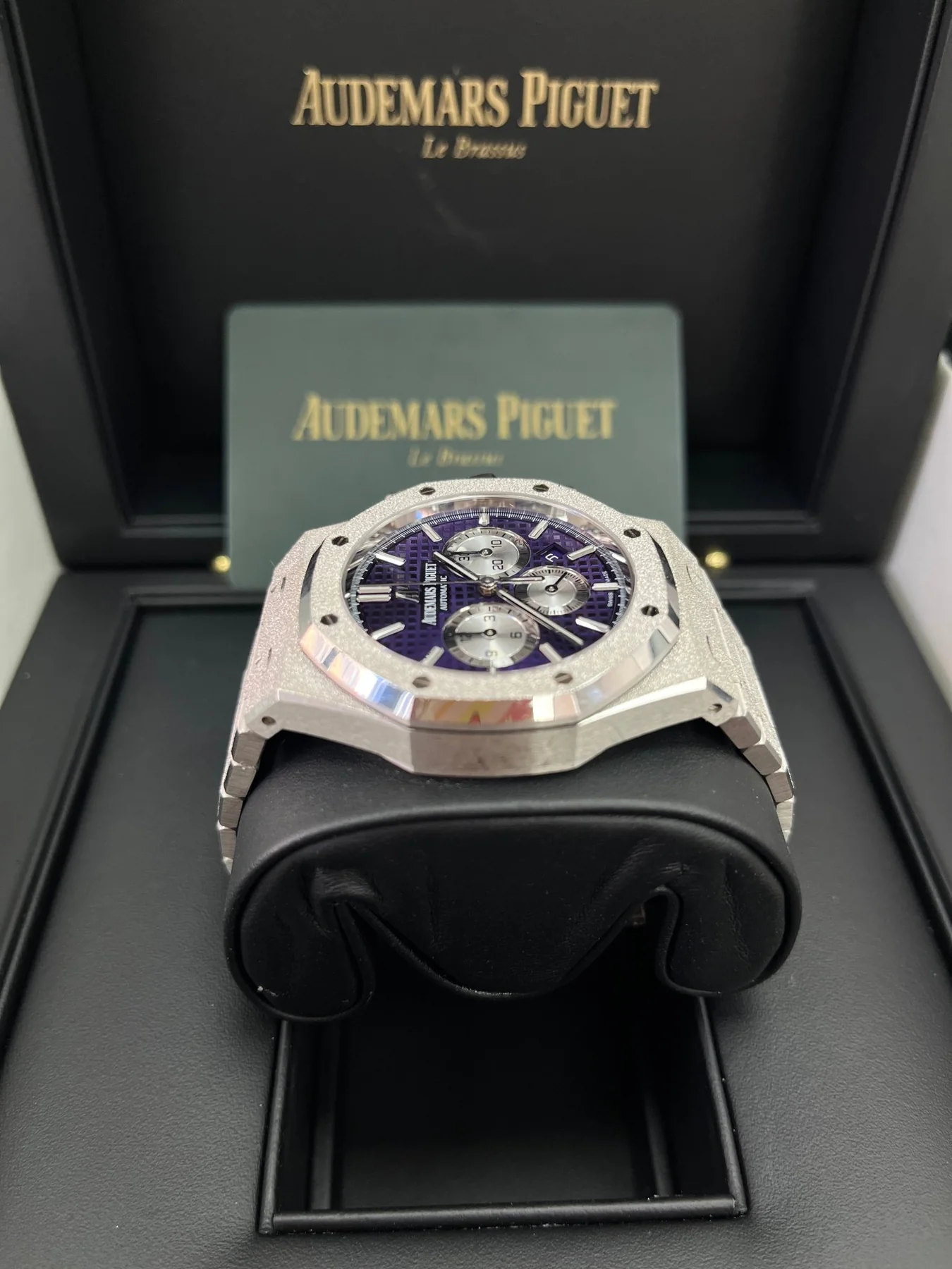 Plum purple dial with “Grande Tapisserie” pattern, rhodium-toned counters, white gold applied hour-markers and Royal Oak hands with luminescent coating.