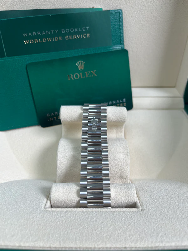 40mm 950 platinum case, screw-down back with Rolex fluting, screw-down crown with twinlock double waterproofness system, smooth bezel, scratch-resistant double anti-reflective sapphire crystal with cyclops lens over the date, meteorite dial, 10 baguette diamond hour markers, Rolex calibre 3255 automatic movement with centre hour, minute and seconds hands, instantaneous day and date in apertures, unrestricted rapid-setting, and stop-seconds for precise time setting, approximately 70 hours of power reserve, President bracelet with three-piece solid links comprised of a polished center link, satin-finished outer links, and ceramic inserts, concealed folding Crownclasp buckle. Waterproof to 100 meters.