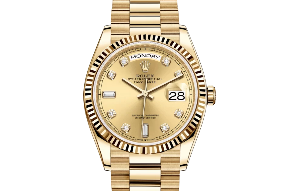 The Rolex fluted bezel is a mark of distinction. Originally, the fluting of the Oyster bezel had a functional purpose: it served to screw the bezel onto the case helping to ensure the waterproofness of the watch. It was therefore identical to the fluting on the case back, which was also screwed onto the case for waterproofness, using specific Rolex tools. Over time, the fluting became an aesthetic element, a genuine Rolex signature feature. Today the fluted bezel is a mark of distinction, in gold on this Day-Date 36.