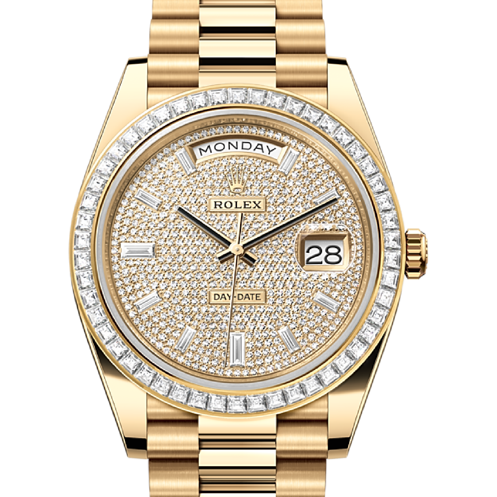 This dial features 10 baguette-cut diamonds. Diamonds, sapphires, rubies, emeralds – the noblest and most precious stones are selected to grace Rolex timepieces. The brand has in-house expertise and equipment enabling it to bejewel any model in its catalogue. Experienced gemmologists first select gemstones of the highest quality. For this, they can rely on their own seasoned judgement as well as state-of-the-art analysis equipment. The stones are then entrusted to the gem-setters, who skilfully place each precious stone onto the watch by hand, one by one, assuring precision to within hundredths of a millimetre. Such stringent tolerances guarantee that each stone shines with optimal brilliance and is perfectly aligned with those around it. These time-honoured gestures, which may be repeated many hundreds of times, ensure that each gem-set watch produced by Rolex sparkles with exceptional intensity and reflects the standard of excellence required by the brand.