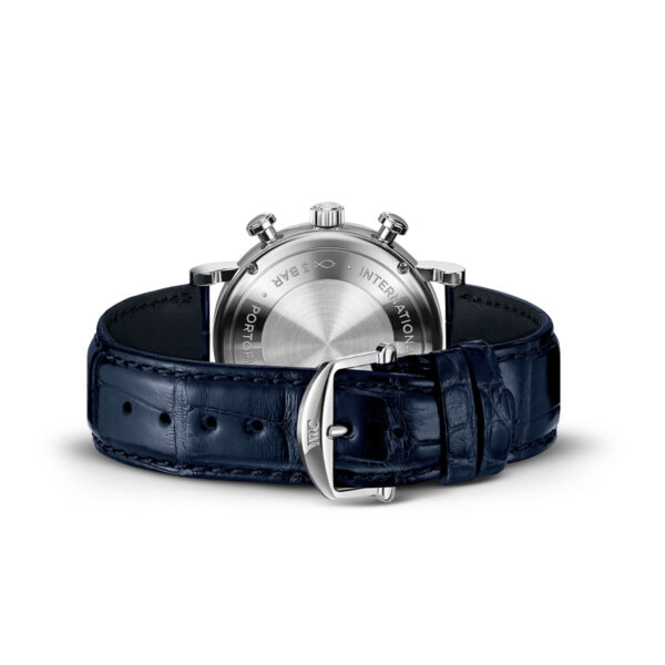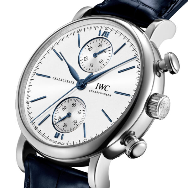 This IWC Portofino Chronograph 39mm brings a sporty touch to the collection with its chronograph function. The watch features a silver dial balanced with two totalisers at the 12 and 6 o’clock positions and contrasted with blue slender feuille hands and applied indices. Housed in a 42mm stainless steel case with pushers and fitted on a matching blue alligator leather strap providing extra comfort to the wearer. This Portofino is also powered by the 79350 Calibre, offering a power reserve of 44 hours.
