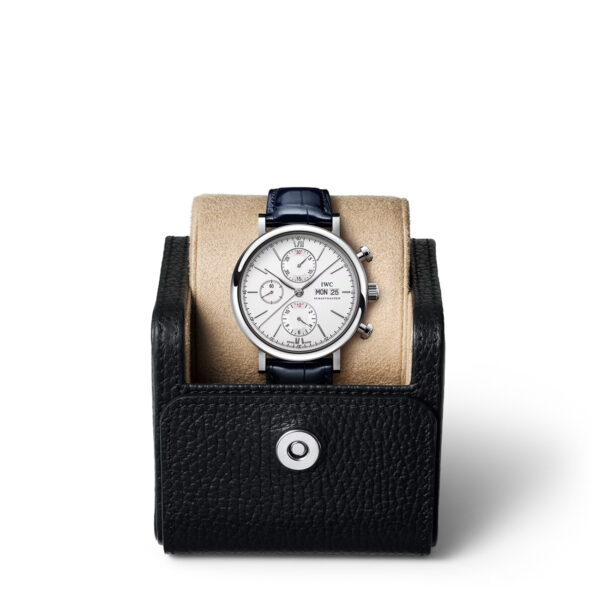This IWC Portofino Chronograph 42mm is sleek and elegant, featuring a silver dial contrasted with blue-coloured hands and appliques on a bold 42mm stainless steel case. The timepiece is fitted on a blue alligator leather strap which complement the sporty pushers on the side. This Portofino is also powered by the 75320 Calibre movement, offering a power reserve of 44 hours.