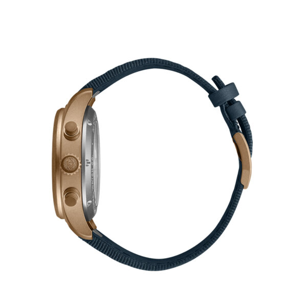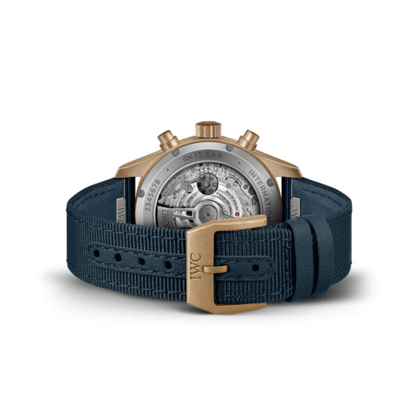 This IWC Pilot’s Watch Chronograph 41mm in bronze offers a distinctive look, featuring a blue dial with subdued beige printing and gold-plated hands on a bronze case which develops patina over time, giving each timepiece a look of its own. Powered by IWC-manufactured 69385 Calibre, visible through the open sapphire case back.