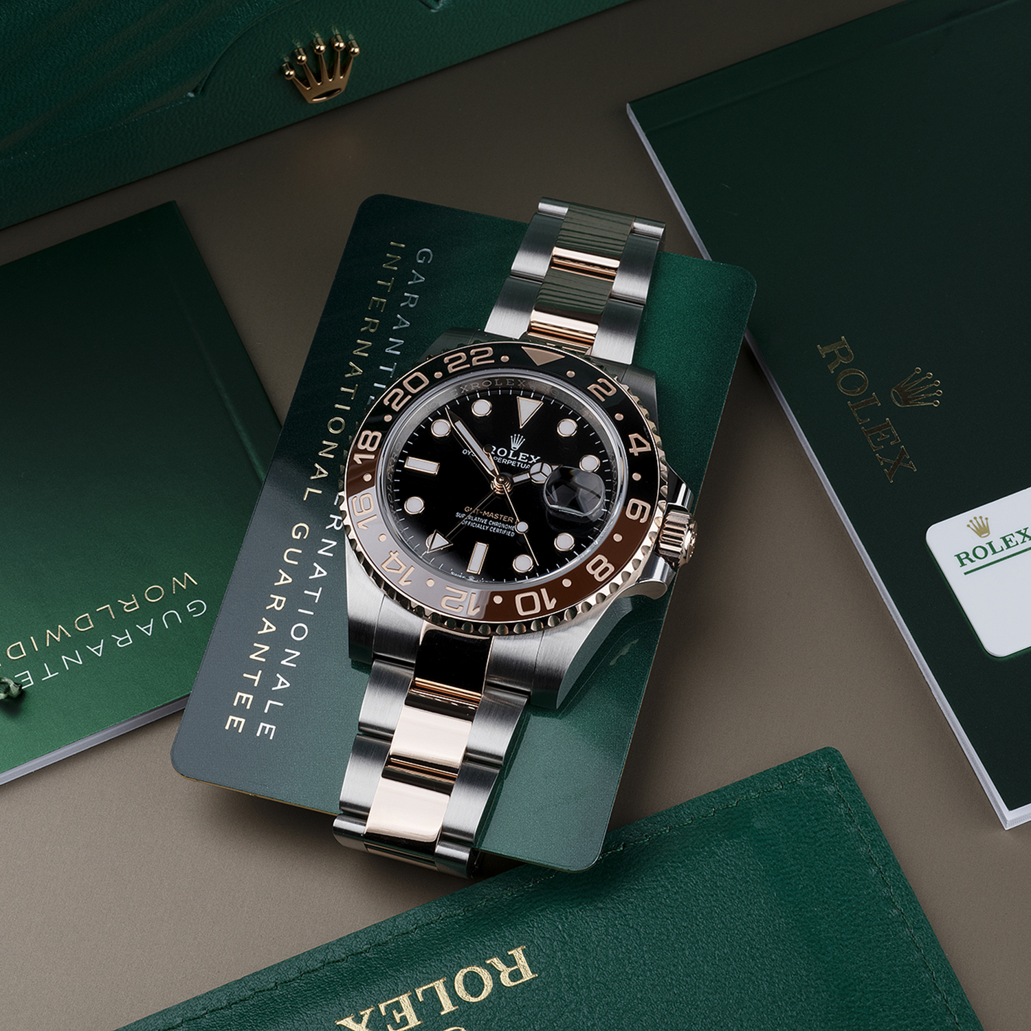The stunning Rolex GMT-Master II 'Root Beer', singlehandedly redefining the standard for bi metal watches! An instant favourite when introduced at Basel world 2019, the Root Beer is sure to quickly become a modern classic. Based on the original Rolex GMT-Master II design, this watch is built in a 40mm Oyster case with a bi directional rotatable bezel enabling calculation of time in a 3rd time zone when read in conjunction with the extra GMT hand.