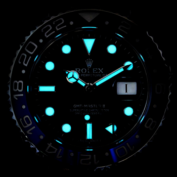 confiarwatchs Rolex GMT-Master II Swiss Replica watches are equipped with the new SuperLuminova™ Blue glow luminescent pigment that after sufficient activation by sunlight or artificial light will glow in the dark up to 9 hours with uniform luminosity throughout.