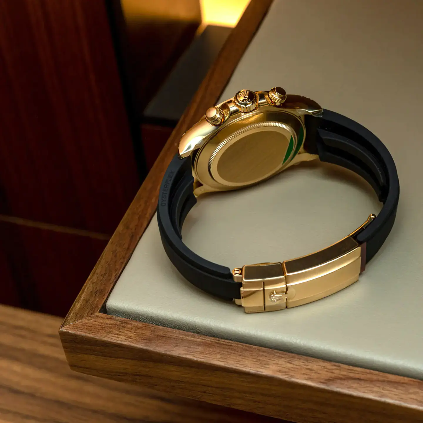 A Rolex Daytona with diamonds is not something new but one with a dial like the 116588TBR sure is! The black-lacquered dial has an applied 18k yellow-gold and diamond-set, wavy structure on the surface, which can remind you of a tiger's fur.