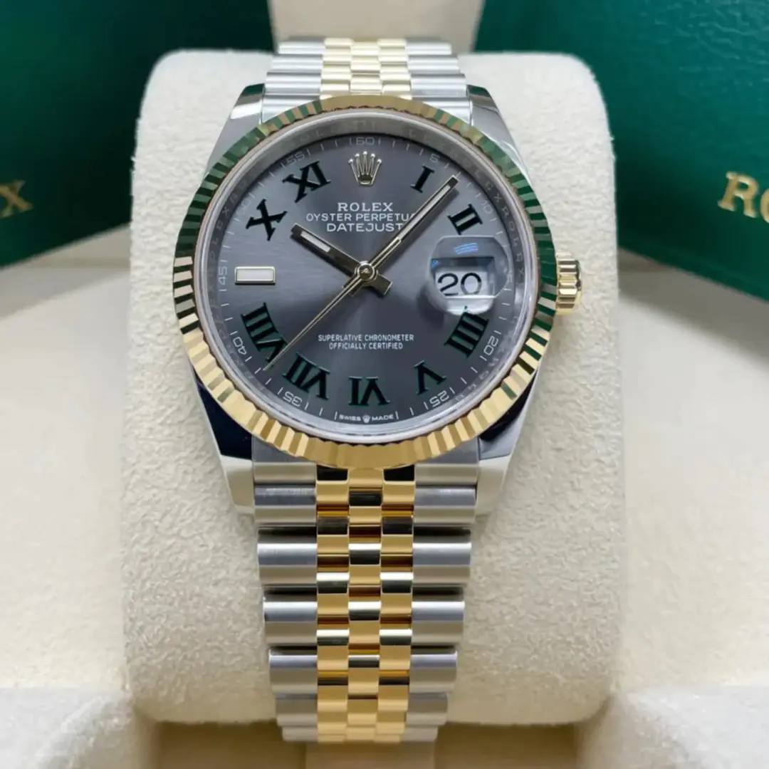 The Rolex fluted bezel is a mark of distinction. Originally, the fluting of the Oyster bezel had a functional purpose: it served to screw the bezel onto the case helping to ensure the waterproofness of the watch. It was therefore identical to the fluting on the case back, which was also screwed onto the case for waterproofness, using specific Rolex tools. Over time, the fluting became an aesthetic element, a genuine Rolex signature feature. Today the fluted bezel is a mark of distinction, in gold on this Datejust 36.