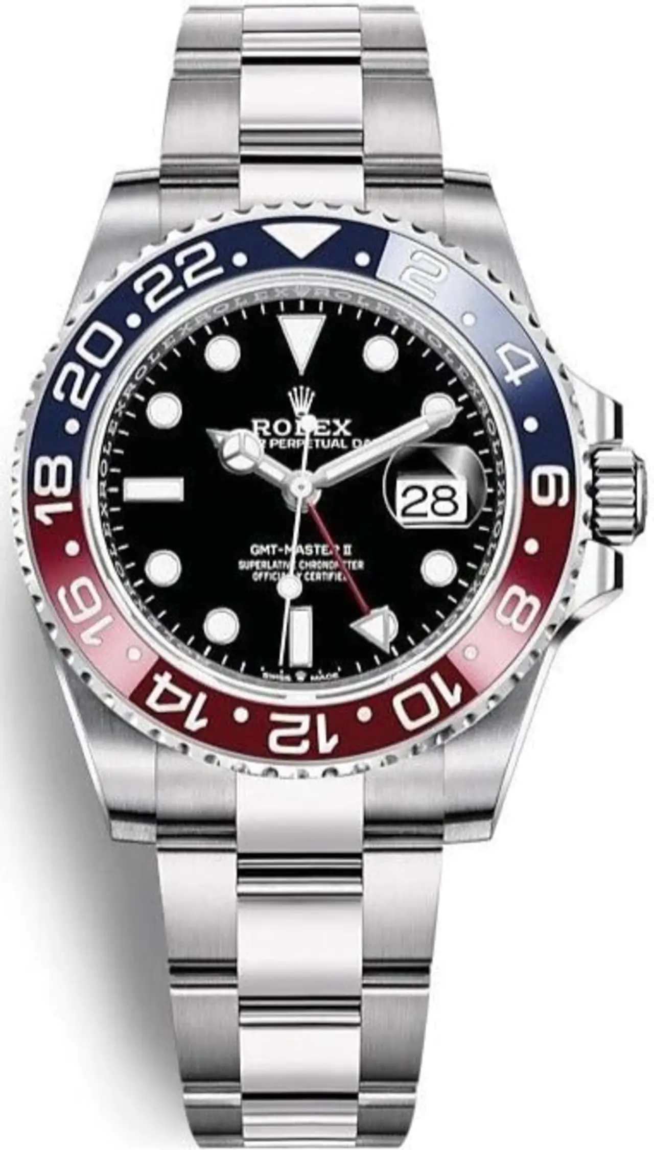 This model features a black dial and a two-colour Cerachrom bezel insert in red and blue ceramic. In addition to conventional hour, minute and seconds hands, the GMT-Master II features an arrow-tipped hand, which circles the dial once every 24 hours, as well as a bidirectional rotatable 24-hour graduated bezel.