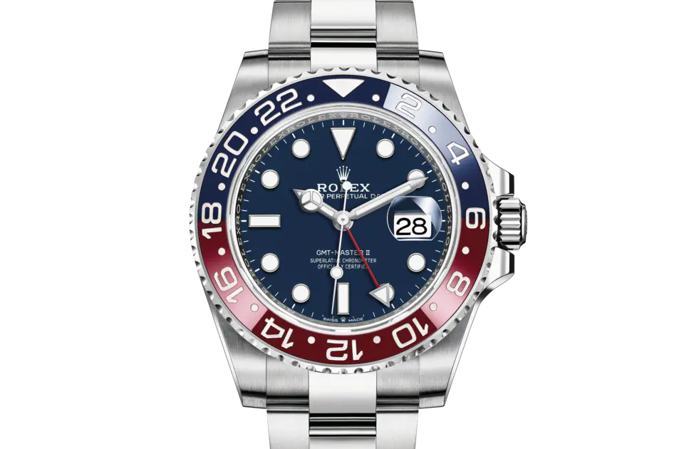In addition to conventional hour, minute and seconds hands, the GMT-Master II features an arrow-tipped hand, which circles the dial once every 24 hours, as well as a bidirectional rotatable 24-hour graduated bezel.