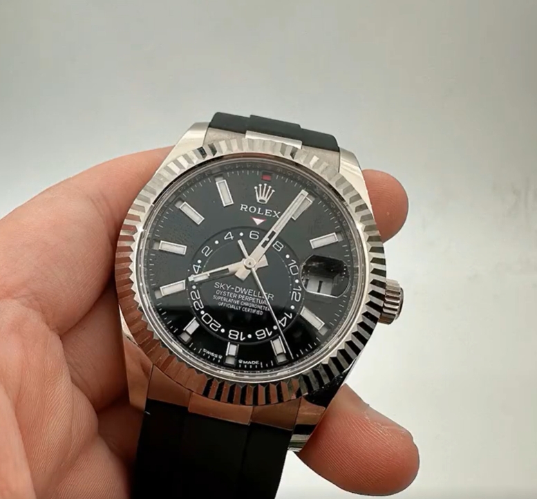 The Oyster Perpetual Sky-Dweller is available in 18 ct white gold with a glossy black dial and an Oysterflex strap. -m336239-0002 42mm