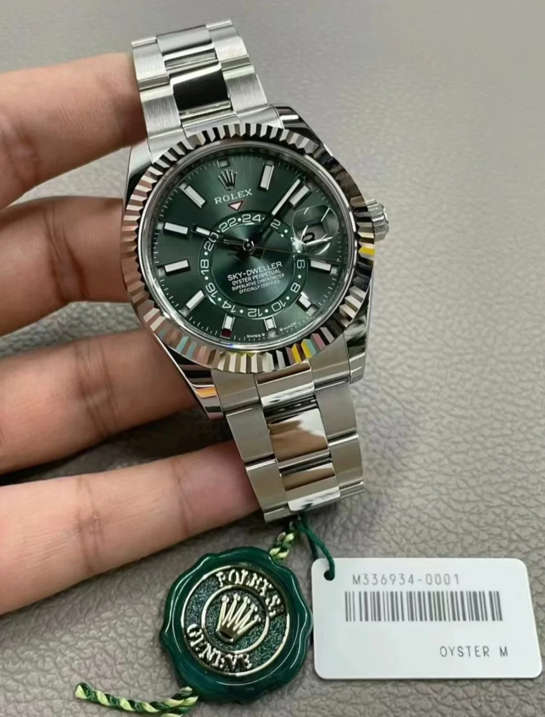 The Oyster Perpetual Sky-Dweller is available in white gold and Oysteel with a mint green dial and an Oyster bracelet. -m336934-0001 42mm