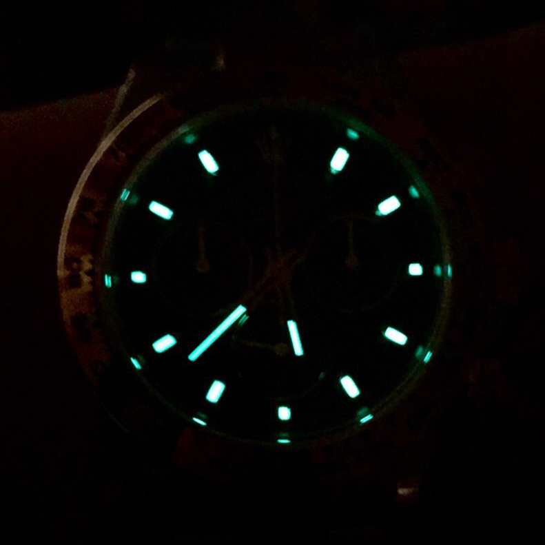 Rolex Daytona Swiss Replica watches are equipped with the new SuperLuminova™ Blue glow luminescent pigment that after sufficient activation by sunlight or artificial light will glow in the dark up to nine hours with uniform luminosity throughout.